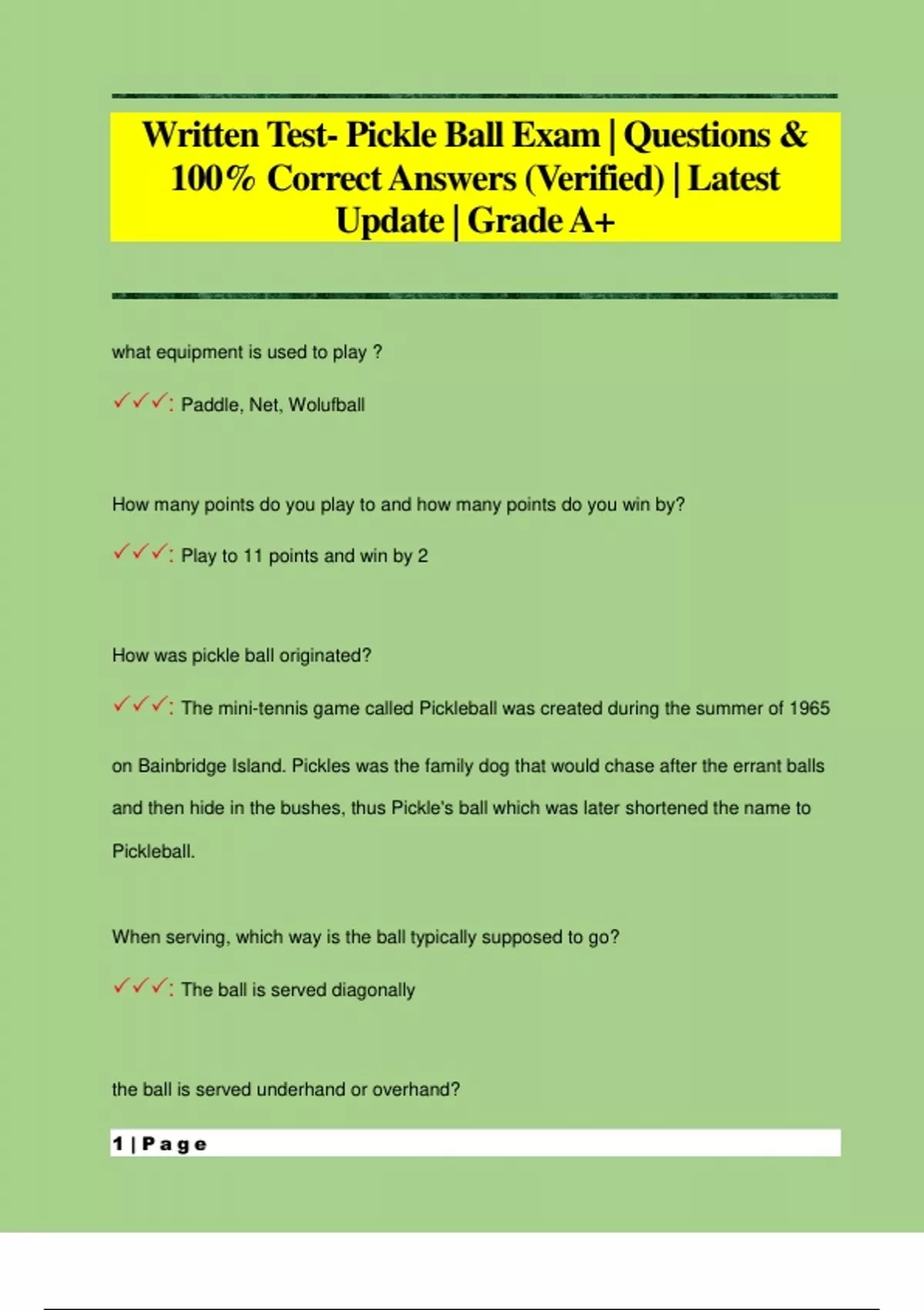 Written Test- Pickle Ball Exam | Questions & 100% Correct Answers (Verified) | Latest Update | Grade A+
