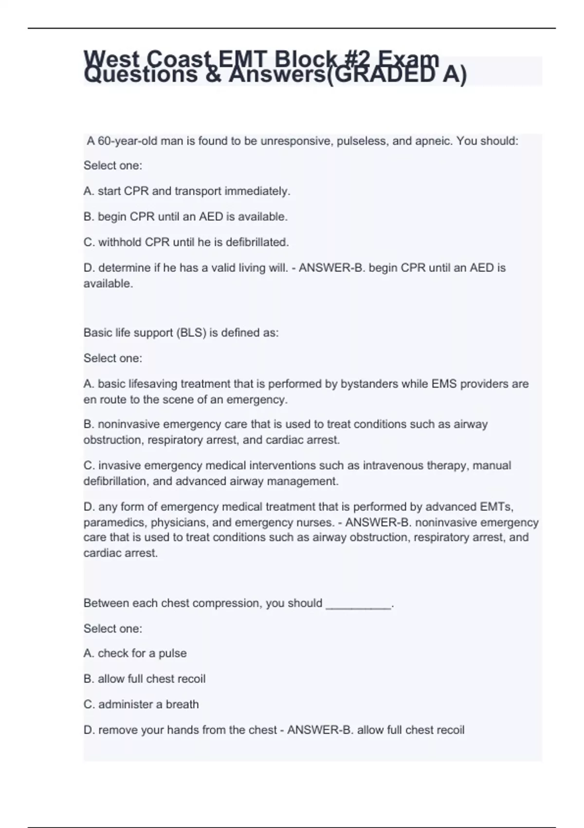A 60-year-old man is found to be unresponsive, pulseless, and apneic. You should: Select one: A. start CPR and transport immediately. B. begin CPR until an AED is available. C. withhold CPR until he is defibrillated. D. determine if he has a valid living will. - ANSWER-B. begin CPR until an AED is available. Basic life support (BLS) is defined as: Select one: A. basic lifesaving treatment that is performed by bystanders while EMS providers are en route to the scene of an emergency. B. noninvasive emergency care that is used to treat conditions such as airway obstruction, respiratory arrest, and cardiac arrest. C. invasive emergency medical interventions such as intravenous therapy, manual defibrillation, and advanced airway management. D. any form of emergency medical treatment that is performed by advanced EMTs, paramedics, physicians, and emergency nurses. - ANSWER-B. noninvasive emergency care that is used to treat conditions such as airway obstruction, respiratory arrest, and cardiac arrest. Between each chest compression, you should __________. Select one: A. check for a pulse B. allow full chest recoil C. administer a breath D. remove your hands from the chest - ANSWER-B. allow full chest recoil Complications associated with chest compressions include all of the following, EXCEPT: Select one: A. a fractured sternum. B. gastric distention. C. rib fractures. D. liver laceration. - ANSWER-B. gastric distention. CPR is in progress on a pregnant woman. Shortly after manually displacing her uterus to the left, return of spontaneous circulation occurs. Which of the following would MOST likely explain this? Select one: A. Displacement of her uterus caused blood to flow backward, which increased blood flow to her heart. B. Increased blood flow to her heart caused her ventricles to stop fibrillating, which restored her pulse. C. Displacement of her uterus allowed her lungs to expand more fully, which restored her pulse. D. Pressure was relieved from her aorta and vena cava, which improved chest compression effectiveness. - ANSWER-D. Pressure was relieved from her aorta and vena cava, which improved chest compression effectiveness.