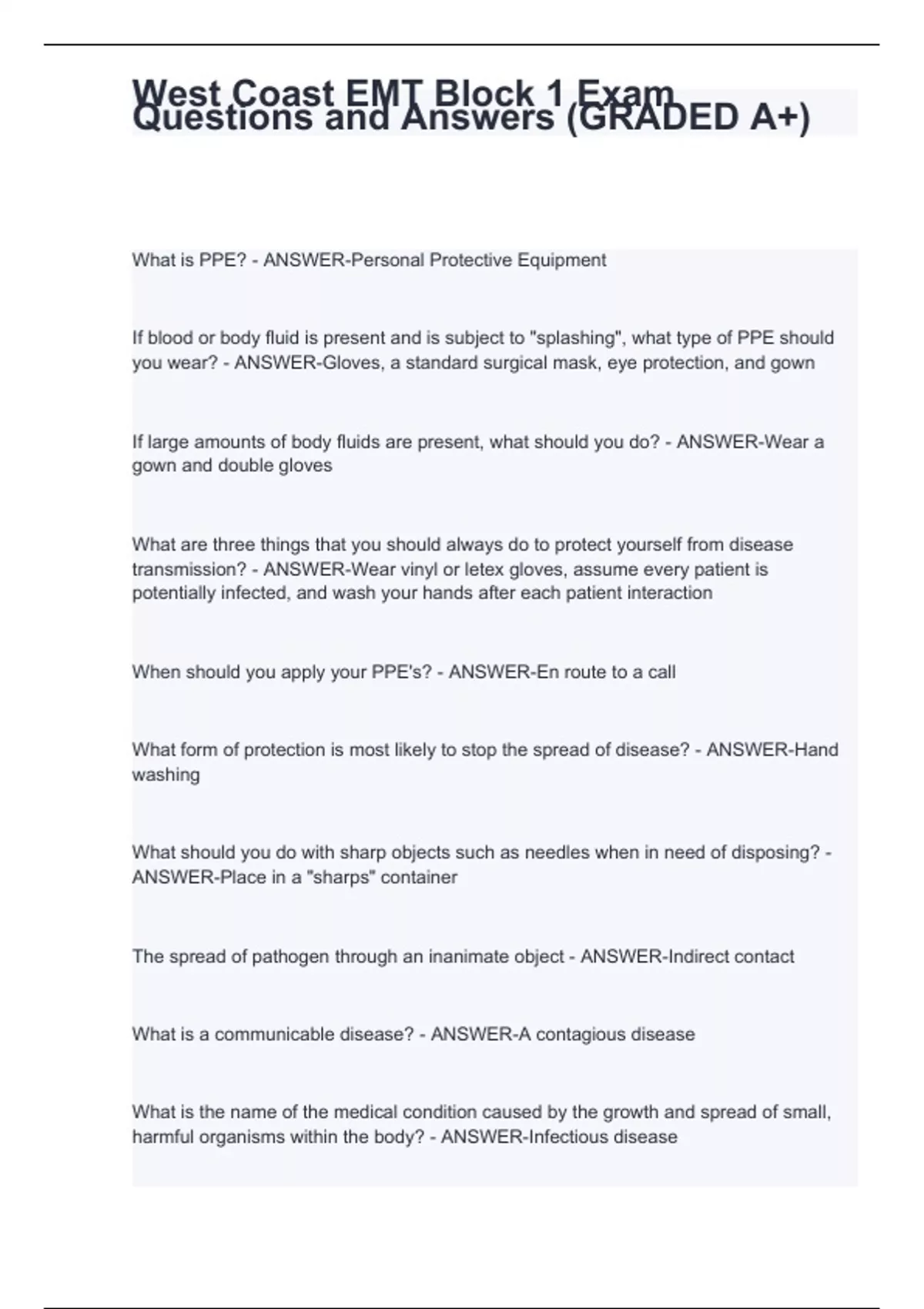 If blood or body fluid is present and is subject to "splashing", what type of PPE should you wear? - ANSWER-Gloves, a standard surgical mask, eye protection, and gown If large amounts of body fluids are present, what should you do? - ANSWER-Wear a gown and double gloves What are three things that you should always do to protect yourself from disease transmission? - ANSWER-Wear vinyl or letex gloves, assume every patient is potentially infected, and wash your hands after each patient interaction When should you apply your PPE's? - ANSWER-En route to a call What form of protection is most likely to stop the spread of disease? - ANSWER-Hand washing What should you do with sharp objects such as needles when in need of disposing? - ANSWER-Place in a "sharps" container The spread of pathogen through an inanimate object - ANSWER-Indirect contact What is a communicable disease? - ANSWER-A contagious disease What is the name of the medical condition caused by the growth and spread of small, harmful organisms within the body? - ANSWER-Infectious disease