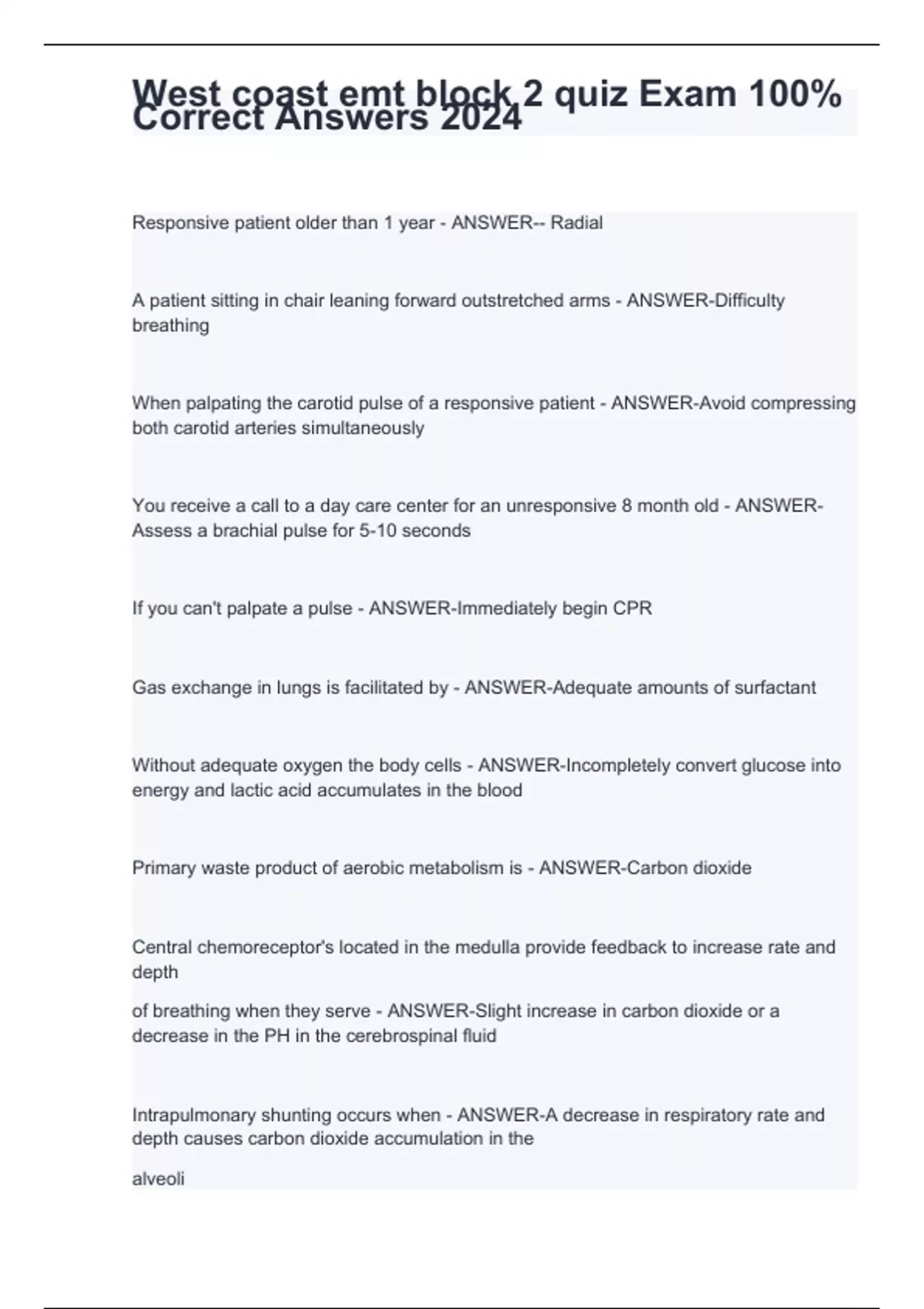 A patient sitting in chair leaning forward outstretched arms - ANSWER-Difficulty breathing When palpating the carotid pulse of a responsive patient - ANSWER-Avoid compressing both carotid arteries simultaneously You receive a call to a day care center for an unresponsive 8 month old - ANSWER-Assess a brachial pulse for 5-10 seconds If you can't palpate a pulse - ANSWER-Immediately begin CPR Gas exchange in lungs is facilitated by - ANSWER-Adequate amounts of surfactant Without adequate oxygen the body cells - ANSWER-Incompletely convert glucose into energy and lactic acid accumulates in the blood Primary waste product of aerobic metabolism is - ANSWER-Carbon dioxide Central chemoreceptor's located in the medulla provide feedback to increase rate and depth of breathing when they serve - ANSWER-Slight increase in carbon dioxide or a decrease in the PH in the cerebrospinal fluid