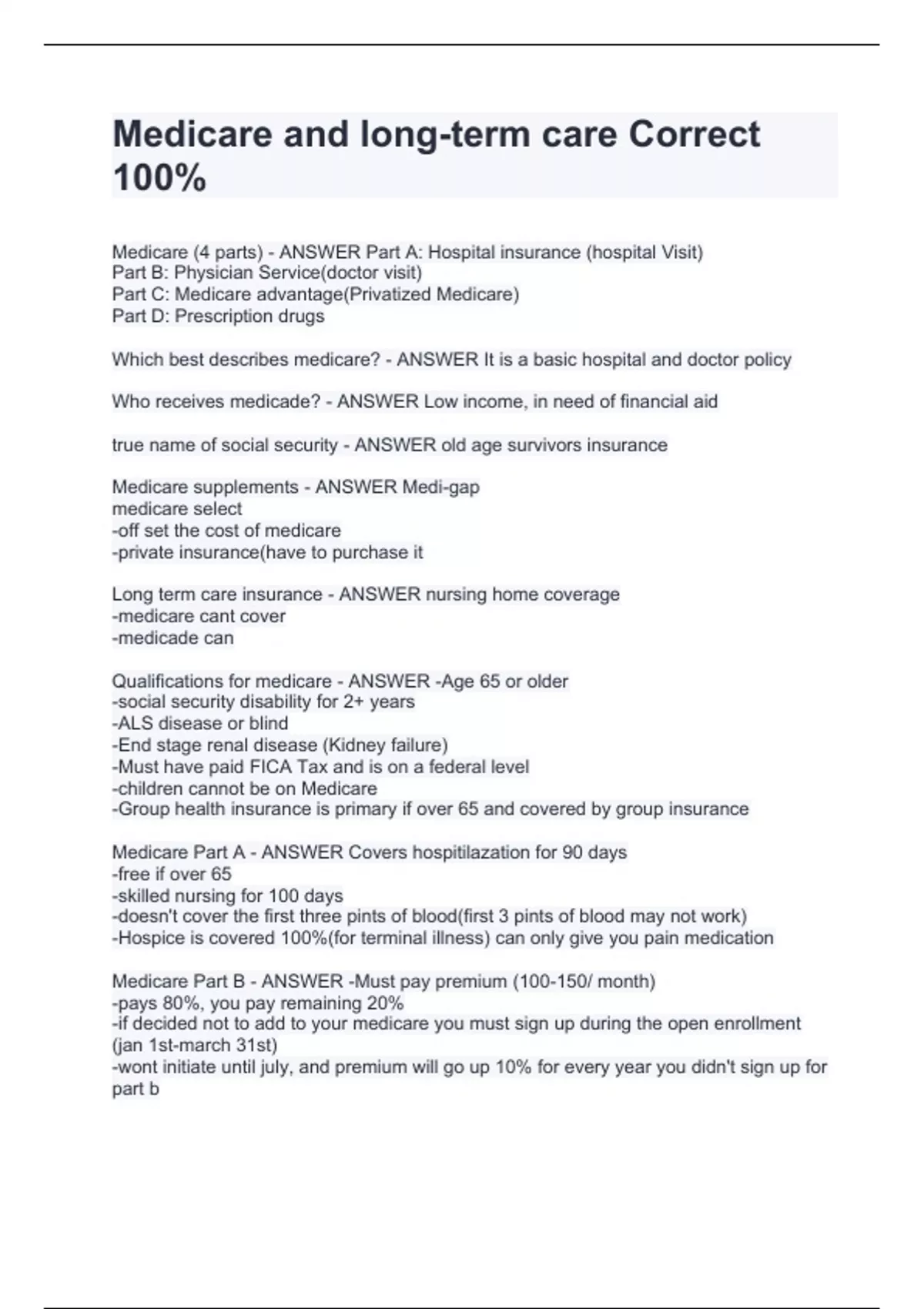 Medicare (4 parts) - ANSWER Part A: Hospital insurance (hospital Visit) Part B: Physician Service(doctor visit) Part C: Medicare advantage(Privatized Medicare) Part D: Prescription drugs Which best describes medicare? - ANSWER It is a basic hospital and doctor policy Who receives medicade? - ANSWER Low income, in need of financial aid true name of social security - ANSWER old age survivors insurance Medicare supplements - ANSWER Medi-gap medicare select -off set the cost of medicare -private insurance(have to purchase it