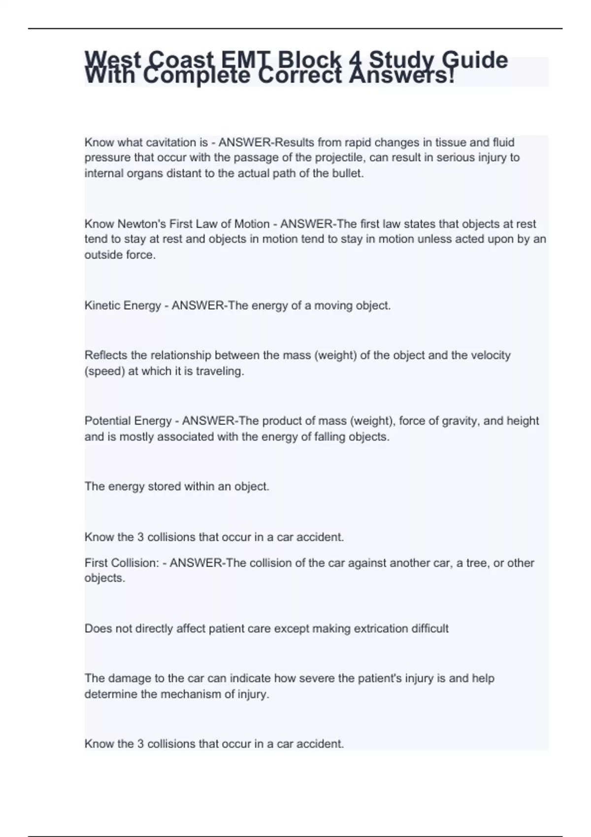 Know Newton's First Law of Motion - ANSWER-The first law states that objects at rest tend to stay at rest and objects in motion tend to stay in motion unless acted upon by an outside force. Kinetic Energy - ANSWER-The energy of a moving object. Reflects the relationship between the mass (weight) of the object and the velocity (speed) at which it is traveling. Potential Energy - ANSWER-The product of mass (weight), force of gravity, and height and is mostly associated with the energy of falling objects. The energy stored within an object. Know the 3 collisions that occur in a car accident. First Collision: - ANSWER-The collision of the car against another car, a tree, or other objects. Does not directly affect patient care except making extrication difficult The damage to the car can indicate how severe the patient's injury is and help determine the mechanism of injury. Know the 3 collisions that occur in a car accident. Second Collision: - ANSWER-The collision of the passenger against the interior of the car. This damage is caused by the kinetic energy produced by the passenger's mass and velocity is converted into the work of stopping the passenger's body.
