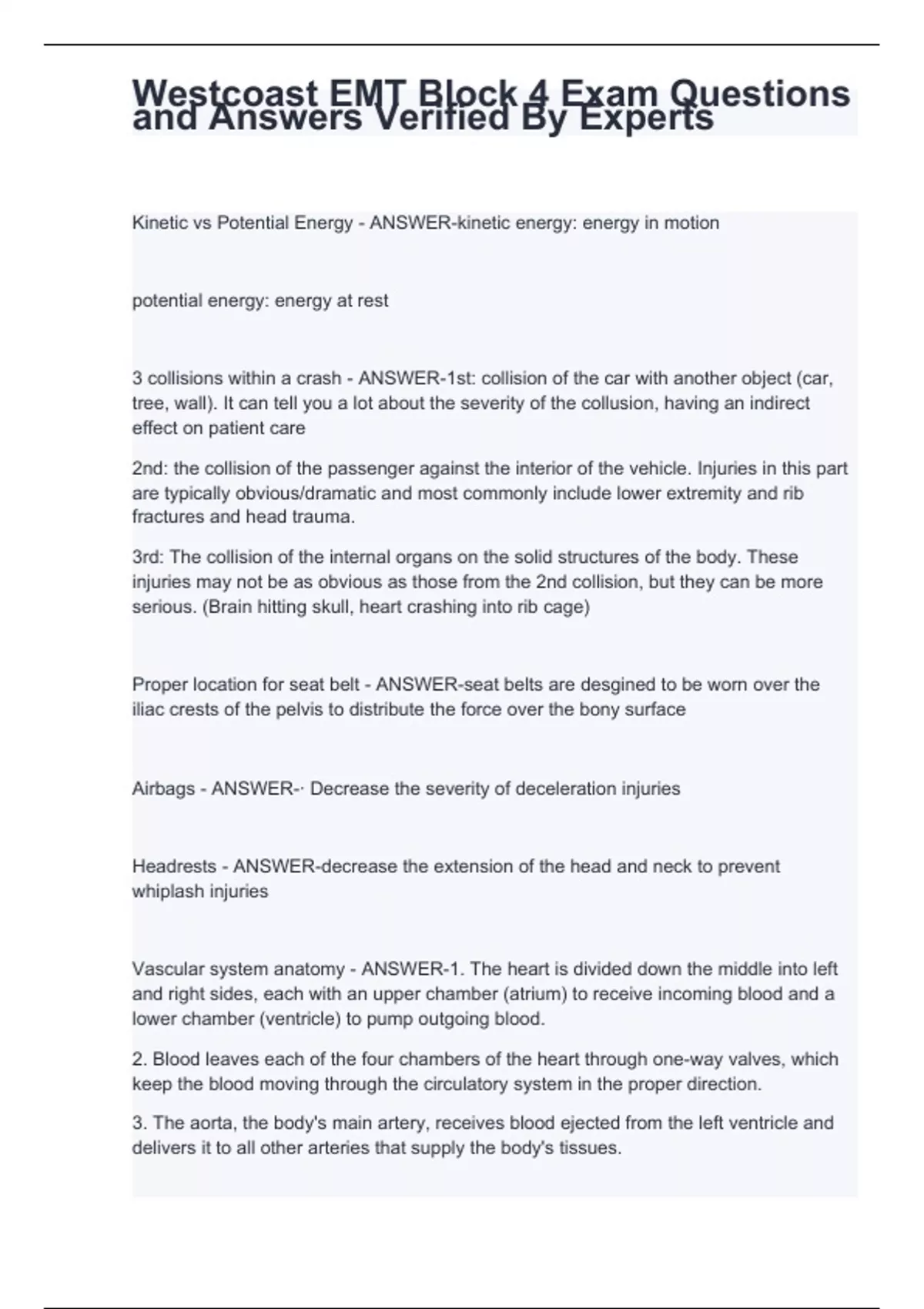 potential energy: energy at rest 3 collisions within a crash - ANSWER-1st: collision of the car with another object (car, tree, wall). It can tell you a lot about the severity of the collusion, having an indirect effect on patient care 2nd: the collision of the passenger against the interior of the vehicle. Injuries in this part are typically obvious/dramatic and most commonly include lower extremity and rib fractures and head trauma. 3rd: The collision of the internal organs on the solid structures of the body. These injuries may not be as obvious as those from the 2nd collision, but they can be more serious. (Brain hitting skull, heart crashing into rib cage) Proper location for seat belt - ANSWER-seat belts are desgined to be worn over the iliac crests of the pelvis to distribute the force over the bony surface Airbags - ANSWER-· Decrease the severity of deceleration injuries Headrests - ANSWER-decrease the extension of the head and neck to prevent whiplash injuries Vascular system anatomy - ANSWER-1. The heart is divided down the middle into left and right sides, each with an upper chamber (atrium) to receive incoming blood and a lower chamber (ventricle) to pump outgoing blood. 2. Blood leaves each of the four chambers of the heart through one-way valves, which