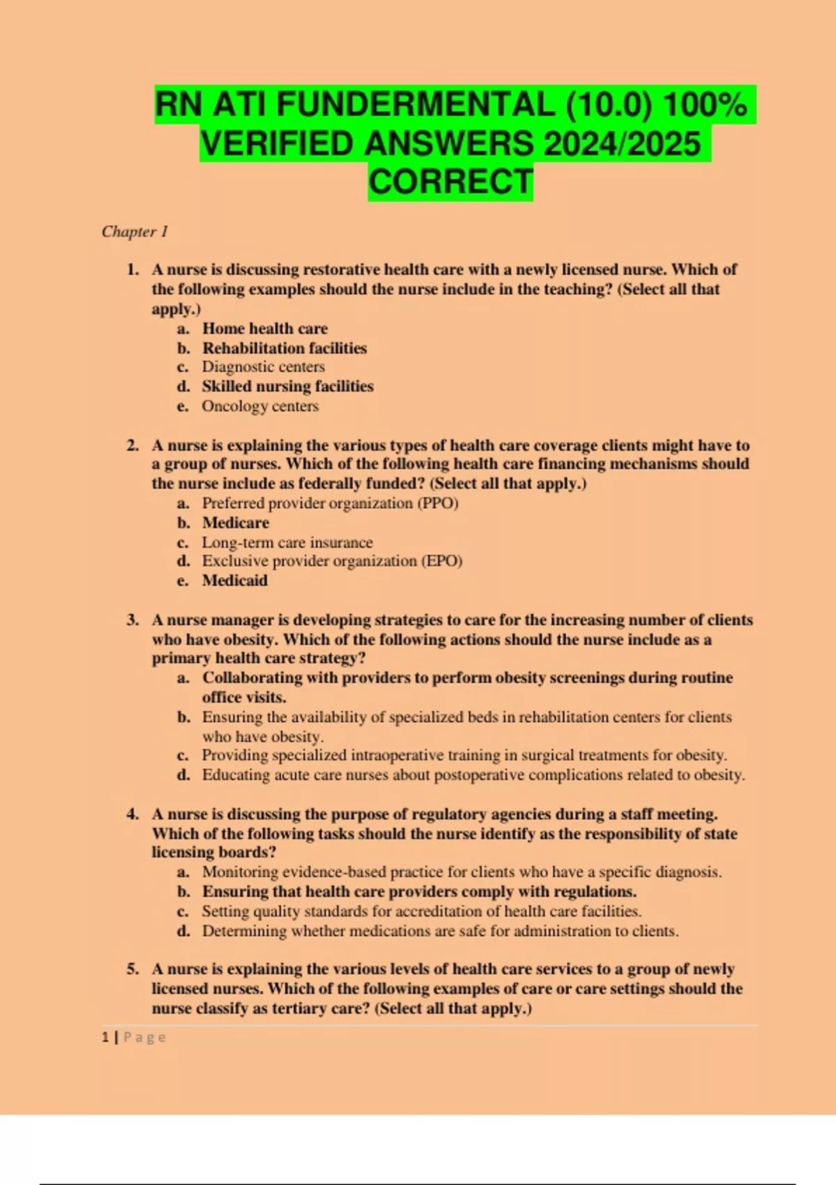RN ATI FUNDERMENTAL RN ATI Fundamentals (10.0) (10.0) 100% VERIFIED ANSWERS 2024/2025 CORRECT
