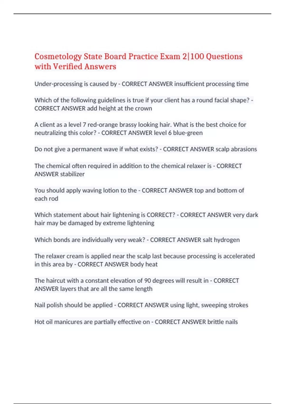 Cosmetology State Board Practice Exam 2|100 Questions with Verified Answers,100% CORRECT