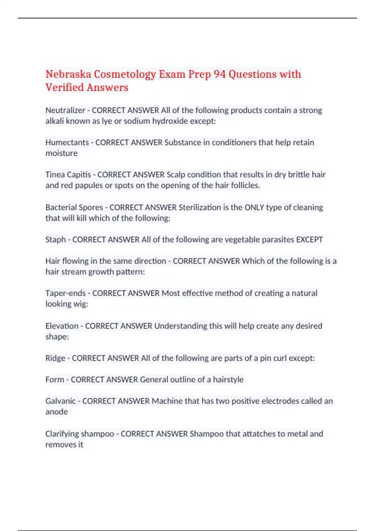 Nebraska Cosmetology Exam Prep 94 Questions with Verified Answers,100% CORRECT