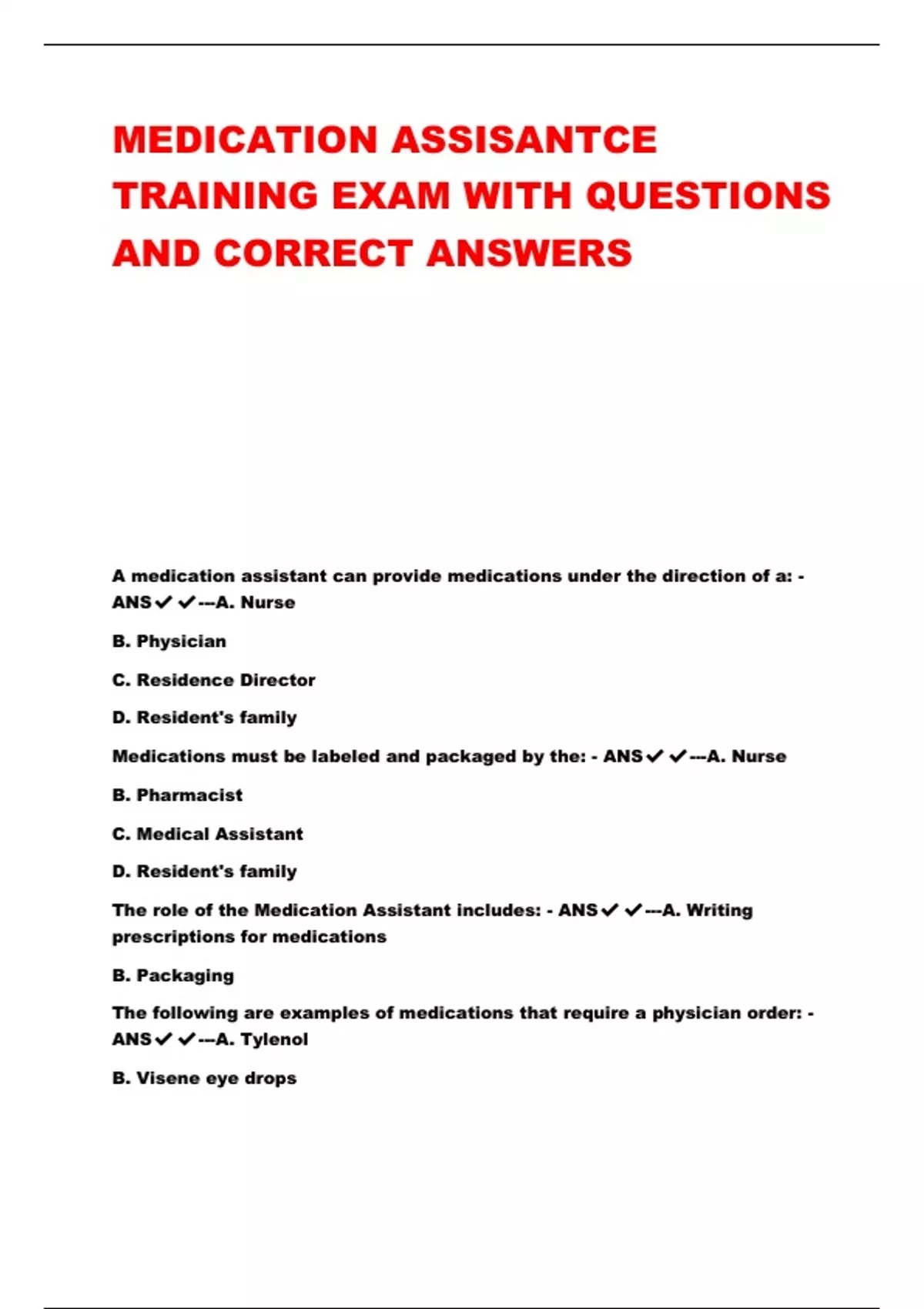MEDICATION ASSISANTCE TRAINING EXAM WITH QUESTIONS AND CORRECT ANSWERS
