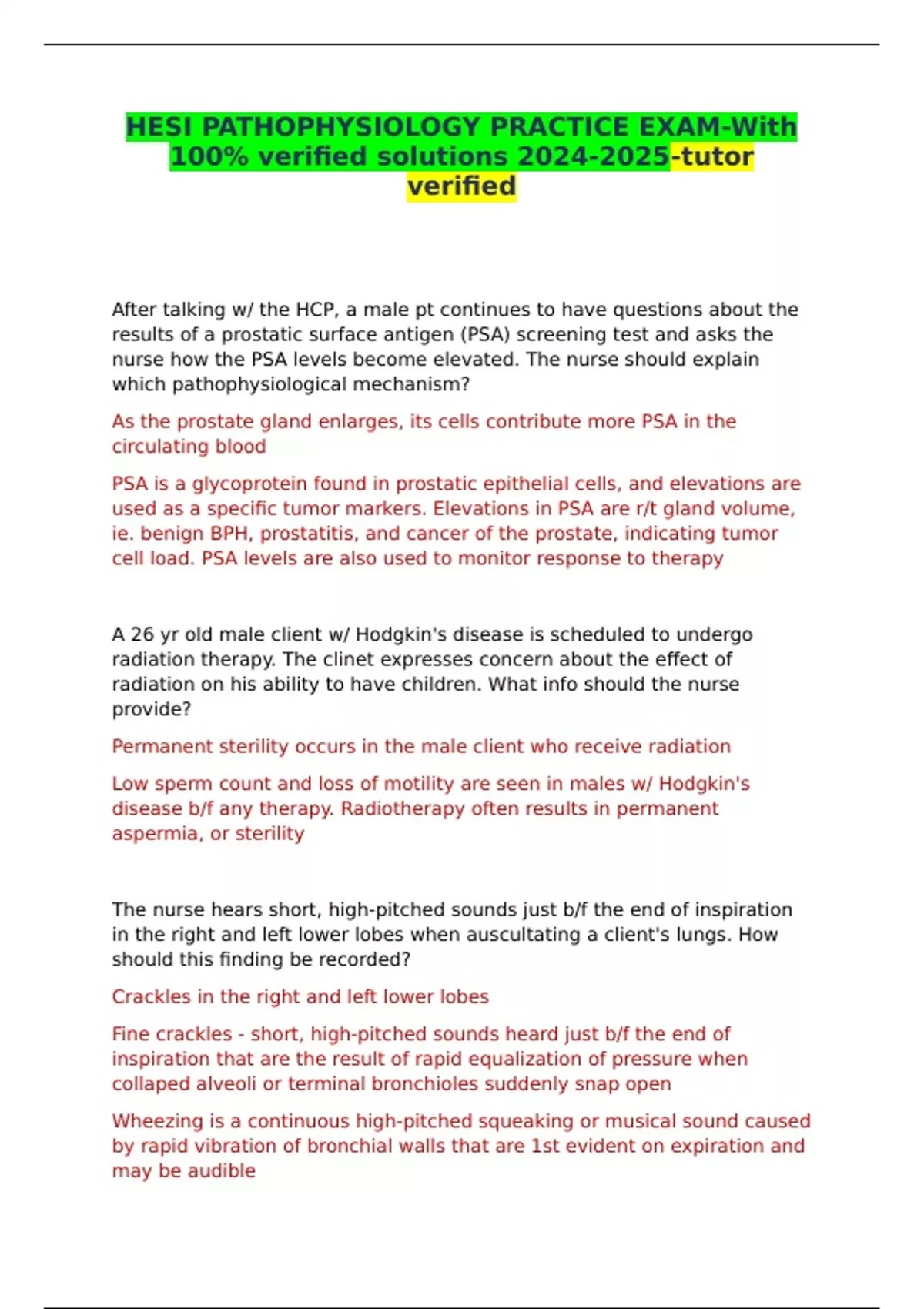 HESI PATHOPHYSIOLOGY PRACTICE EXAM-With 100% verified solutions -tutor verified