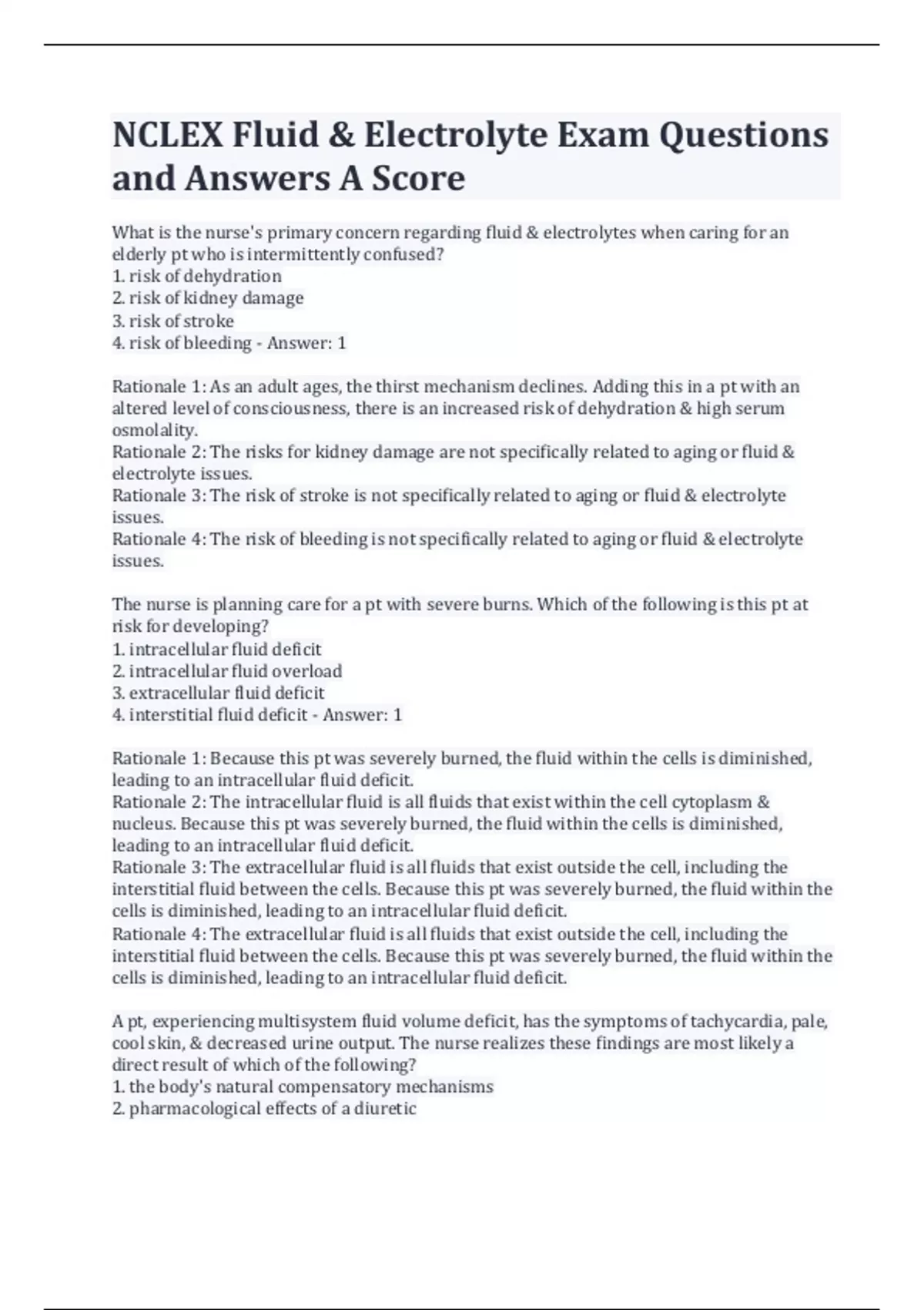 NCLEX Fluid & Electrolyte Exam Questions and Answers A Score What is the nurse's primary concern regarding fluid & electrolytes when caring for an elderly pt who is intermittently confused? 1. risk of dehydration 2. risk of kidney damage 3. risk of stroke 4. risk of bleeding - Answer: 1 Rationale 1: As an adult ages, the thirst mechanism declines. Adding this in a pt with an altered level of consciousness, there is an increased risk of dehydration & high serum osmolality. Rationale 2: The risks for kidney damage are not specifically related to aging or fluid & electrolyte issues. Rationale 3: The risk of stroke is not specifically related to aging or fluid & electrolyte issues. Rationale 4: The risk of bleeding is not specifically related to aging or fluid & electrolyte issues. The nurse is planning care for a pt with severe burns. Which of the following is this pt at risk for developing? 1. intracellular fluid deficit 2. intracellular fluid overload 3. extracellular fluid deficit 4. interstitial fluid deficit - Answer: 1 Rationale 1: Because this pt was severely burned, the fluid within the cells is diminished, leading to an intracellular fluid deficit. Rationale 2: The intracellular fluid is all fluids that exist within the cell cytoplasm & nucleus. Because this pt was severely burned, the fluid within the cells is diminished, leading to an intracellular fluid deficit. Rationale 3: The extracellular fluid is all fluids that exist outside the cell, including the interstitial fluid between the cells. Because this pt was severely burned, the fluid within the cells is diminished, leading to an intracellular fluid deficit. Rationale 4: The extracellular fluid is all fluids that exist outside the cell, including the interstitial fluid between the cells. Because this pt was severely burned, the fluid within the cells is diminished, leading to an intracellular fluid deficit. A pt, experiencing multisystem fluid volume deficit, has the symptoms of tachycardia, pale, cool skin, & decreased urine output. The nurse realizes these findings are most likely a direct result of which of the following? 1. the body's natural compensatory mechanisms 2. pharmacological effects of a diuretic 3. effects of rapidly infused intravenous fluids 4. cardiac failure - Answer: 1 Rationale 1: The internal vasoconstrictive compensatory reactions within the body are responsible for the symptoms exhibited. The body naturally attempts to conserve fluid internally specifically for the brain & heart. Rationale 2: A diuretic would cause further fluid loss, & is contraindicated. Rationale 3: Rapidly infused intravenous fluids would not cause a decrease in urine output. Rationale 4: The manifestations reported are not indicative of cardiac failure in this pt. A pregnant pt is admitted with excessive thirst, increased urination, & has a medical diagnosis of diabetes insipidus. The nurse chooses which of the following nursing diagnoses as most appropriate? 1. Risk for Imbalanced Fluid Volume 2. Excess Fluid Volume 3. Imbalanced Nutrition 4. Ineffective Tissue Perfusion - Answer: 1 Rationale 1: The pt with excessive thirst, increased urination & a medical diagnosis of diabetes insipidus is at risk for Imbalanced Fluid Volume due to the pt &'s excess volume loss that can increase the serum levels of sodium. Rationale 2: Excess Fluid Volume is not an issue for pts with diabetes insipidus, especially during the early stages of treatment. Rationale 3: Imbalanced Nutrition does not apply. Rationale 4: Ineffective Tissue Perfusion does not apply A pt recovering from surgery has an indwelling urinary catheter. The nurse would contact the pt's primary healthcare provider with which of the following 24-hour urine output volumes? 1. 600 mL 2. 750 mL 3. 1000 mL 4. 1200 mL - Answer: 1 Rationale 1: A urine output of less than 30 mL per hour must be reported to the primary healthcare provider. This indicates inadequate renal perfusion, placing the pt at increased risk for acute renal failure & inadequate tissue perfusion. A minimum of 720 mL over a 24-hour period is desired (30 mL multiplied by 24 hours equals 720 mL per 24 hours). A pt is receiving intravenous fluids postoperatively following cardiac surgery. Nursing assessments should focus on which postoperative complication? 1. fluid volume excess 2. fluid volume deficit 3. seizure activity 4. liver failure - Answer: 1 Rationale 1: Antidiuretic hormone & aldosterone levels are commonly increased following the stress response before, during, & immediately after surgery. This increase leads to sodium & water retention. Adding more fluids intravenously can cause a fluid volume excess & stress upon the heart & circulatory system. Rationale 2: Adding more fluids intravenously can cause a fluid volume excess, not fluid volume deficit, & stress upon the heart & circulatory system. Rationale 3: Seizure activity would more commonly be associated with electrolyte imbalances. Rationale 4: Liver failure is not anticipated related to postoperative intravenous fluid administration. A pt is diagnosed with severe hyponatremia. The nurse realizes this pt will mostly likely need which of the following precautions implemented? 1. seizure 2. infection 3. neutropenic 4. high-risk fall - Answer: 1 Rationale 1: Severe hyponatremia can lead to seizures. Seizure precautions such as a quiet environment, raised side rails, & having an oral airway at the bedside would be included. Rationale 2: Infection precautions not specifically indicated for a pt with hyponatremia. Rationale 3: Neutropenic precautions not specifically indicated for a pt with hyponatremia. Rationale 4: High-risk fall precautions not specifically indicated for a pt with hyponatremia. A pt is diagnosed with hypokalemia. After reviewing the pt's current medications, which of the following might have contributed to the pt's health problem? 1. corticosteroid 2. thiazide diuretic 3. narcotic 4. muscle relaxer - Answer: 1 Rationale 1: Excess potassium l