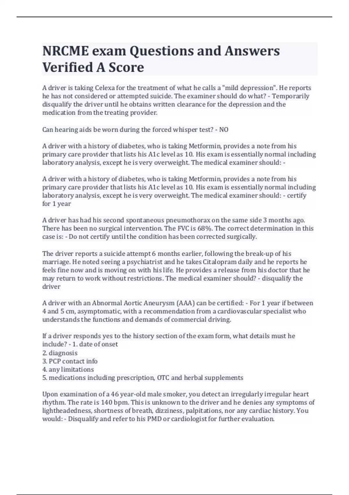 NRCME exam Questions and Answers Verified A Score A driver is taking Celexa for the treatment of what he calls a "mild depression". He reports he has not considered or attempted suicide. The examiner should do what? - Temporarily disqualify the driver until he obtains written clearance for the depression and the medication from the treating provider. Can hearing aids be worn during the forced whisper test? - NO A driver with a history of diabetes, who is taking Metformin, provides a note from his primary care provider that lists his A1c level as 10. His exam is essentially normal including laboratory analysis, except he is very overweight. The medical examiner should: - A driver with a history of diabetes, who is taking Metformin, provides a note from his primary care provider that lists his A1c level as 10. His exam is essentially normal including laboratory analysis, except he is very overweight. The medical examiner should: - certify for 1 year A driver has had his second spontaneous pneumothorax on the same side 3 months ago. There has been no surgical intervention. The FVC is 68%. The correct determination in this case is: - Do not certify until the condition has been corrected surgically. The driver reports a suicide attempt 6 months earlier, following the break-up of his marriage. He noted seeing a psychiatrist and he takes Citalopram daily and he reports he feels fine now and is moving on with his life. He provides a release from his doctor that he may return to work without restrictions. The medical examiner should? - disqualify the driver A driver with an Abnormal Aortic Aneurysm (AAA) can be certified: - For 1 year if between 4 and 5 cm, asymptomatic, with a recommendation from a cardiovascular specialist who understands the functions and demands of commercial driving. If a driver responds yes to the history section of the exam form, what details must he include? - 1. date of onset 2. diagnosis 3. PCP contact info 4. any limitations 5. medications including prescription, OTC and herbal supplements Upon examination of a 46 year-old male smoker, you detect an irregularly irregular heart rhythm. The rate is 140 bpm. This is unknown to the driver and he denies any symptoms of lightheadedness, shortness of breath, dizziness, palpitations, nor any cardiac history. You would: - Disqualify and refer to his PMD or cardiologist for further evaluation. Which of the following best describes the length of time to certify a driver who has non-insulin diabetes mellitus treated with oral medication and no other medical issues? - While such drivers may be certified for 2 years, the FMCSA prefers that such drivers should have annual re-certification examinations. A driver was discharged from the hospital 10 weeks ago after an MI. He is asymptomatic and has a note from the cardiologist that he had a satisfactory in office ETT the week prior to your examination and that he may drive. His pre-discharge ECHO shows an EF of 45%. His examination is normal. Your determination: - certify for 1 year because waiting period is at least 2 months after MI, no sypmtoms, ETT pass, LVEF greater than 40 and no ECG changes What are the 3 things that ME and driver must do with the certificate? - 1. ME must retain copy for at least 3 years 2. ME must provide a copy to prospective or current employer upon request 3. driver must carry certificate while operating CMV A 69 year-old male driver had a femoral-popliteal bypass 4 months ago with resolution of chronic leg pain due to claudication. His surgeon clears him for driving. He is on coumadin with INRs consistently in the therapeutic range since discharge. The correct determination is: - Meets standards, qualified for one year. What physical abilities must drivers have? - grip strength, upper body strength and balance and flexibility A driver returns to work after a two week absence due to a respiratory illness. He presents a note from his physician that he was unable to work as a truck driver because of the illness and is now cleared for returning to work. His medical certificate expires in 3 months. The driver: - should undergo a new examination A driver is found to have diminished central acuity during Snellen chart acuity testing. This is suggestive of: - macular degeneration As the medical examiner you notice a patient's urinalysis is positive for 3+ protein. You should: - Determine if additional evaluation is required and request or recommend primary care provider follow-up. What are the regulatory non-discretionary standards? - E-HIV Epilepsy, Hearing, Insulin, Vison A 47 year-old driver with a Fixed Deficit of an Extremity should have a physical exam - Biannually or more frequently if indicated. Can you provide a copy of the Medical Examination Certificate to the driver and a copy to the employer? - YES A 50 year-old male smoker had a percutaneous coronary intervention procedure 2 weeks ago after an abnormal stress test. He is asymptomatic, stage 2 HTN controlled on ramapril and labetolol. What is the certification period? - Certify 6 months. Advise to have ETT before 6 month follow up. If he remains stable with a normal ETT, certify for one year. CAn a driver with a hearing aid use it to pass hearing test? - Yes he can use hearing aid to undergo the forced whisper test. Also he should carry a spare power source for his hearing aids while driving A driver is unable to pick out the numbers in an Ishihara color blindness test. However, he is able to distinguish red, green, and amber stoplights. Can he be certified? - He may be fully qualified for 2 years.
