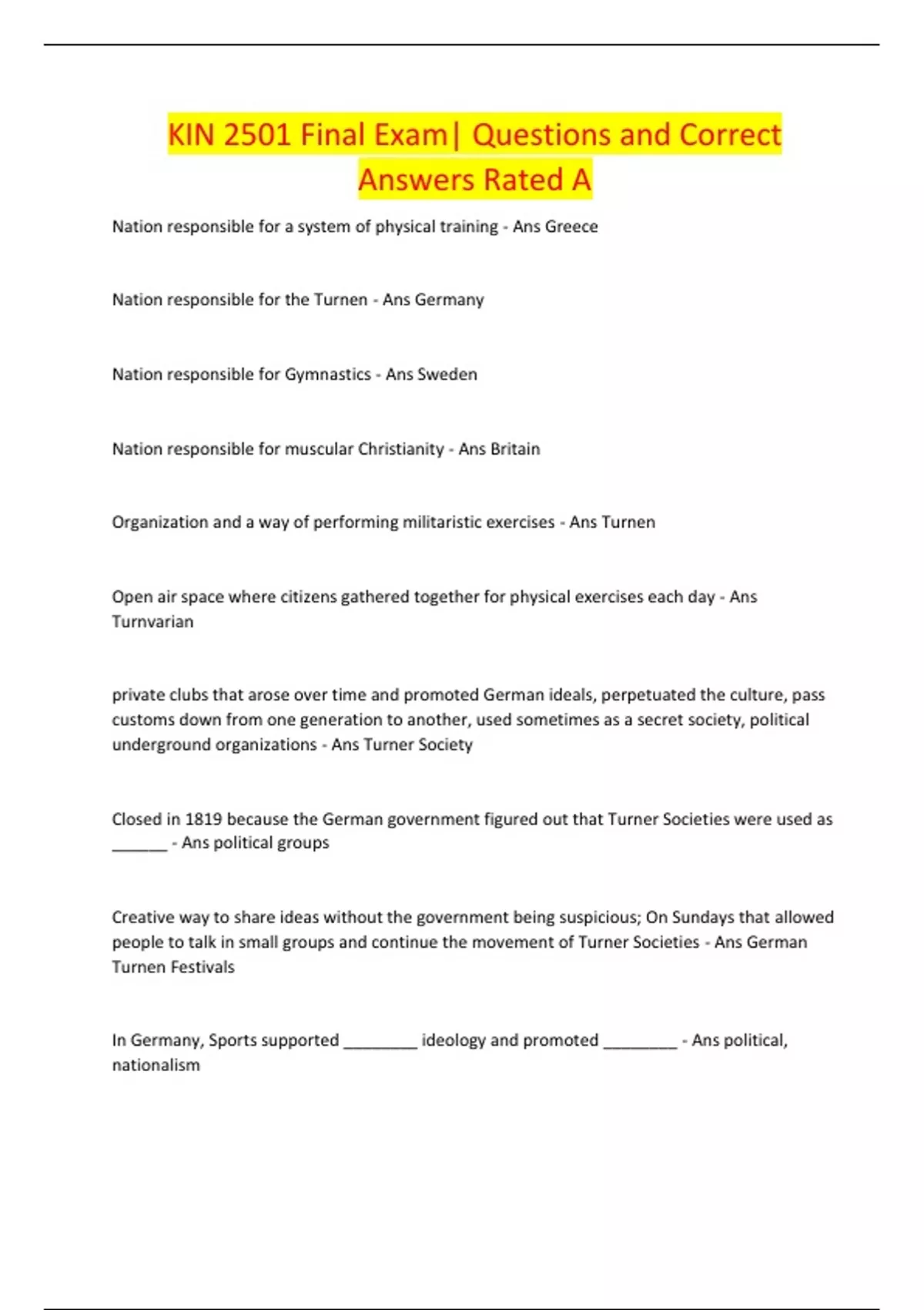 KIN 2501 Final Exam| Questions and Correct Answers Rated A