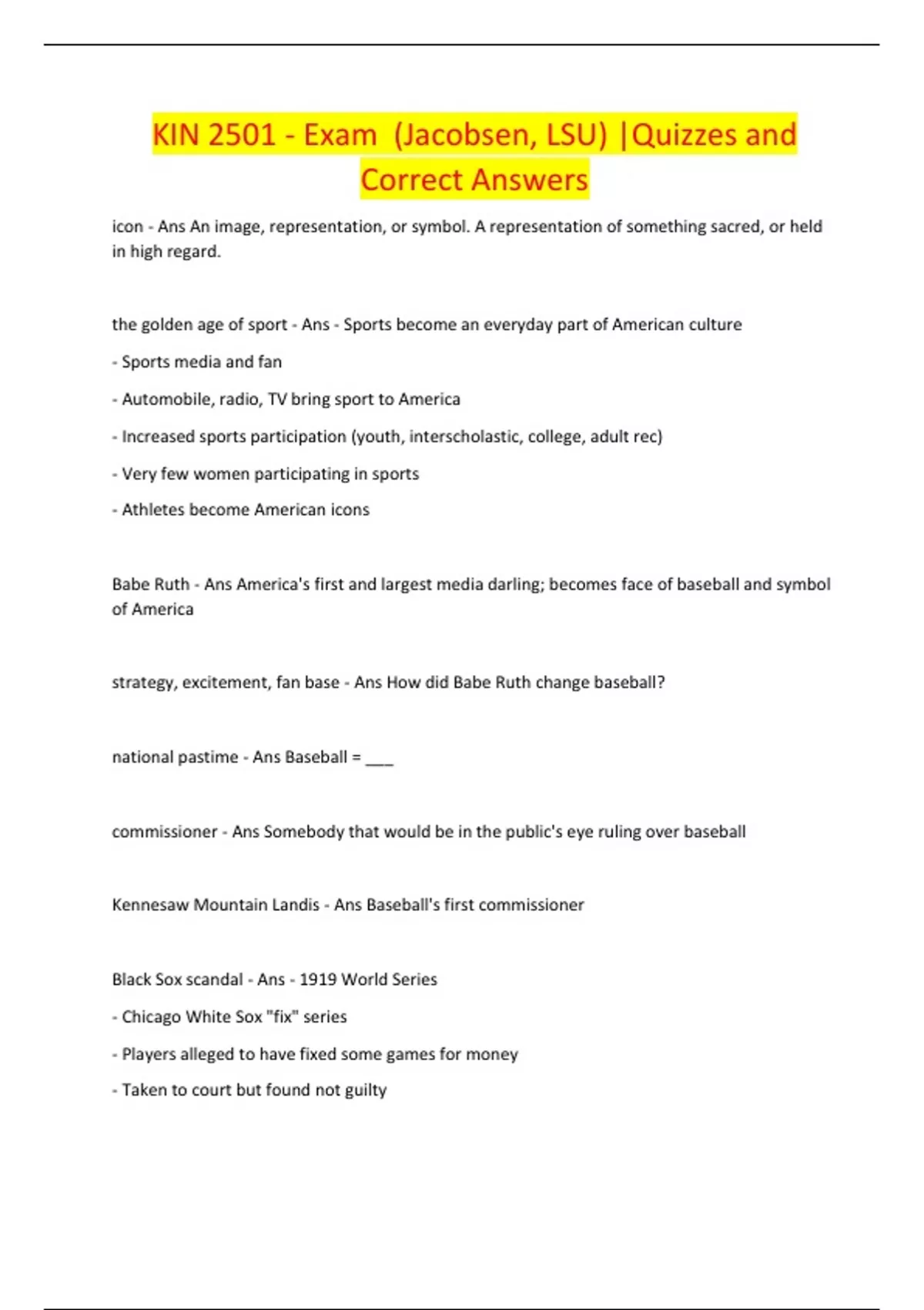 KIN 2501 - Exam (Jacobsen, LSU) |Quizzes and Correct Answers icon - Ans An image, representation, or symbol. A representation of something sacred, or held in high regard. the golden age of sport - Ans - Sports become an everyday part of American culture - Sports media and fan - Automobile, radio, TV bring sport to America - Increased sports participation (youth, interscholastic, college, adult rec) - Very few women participating in sports - Athletes become American icons