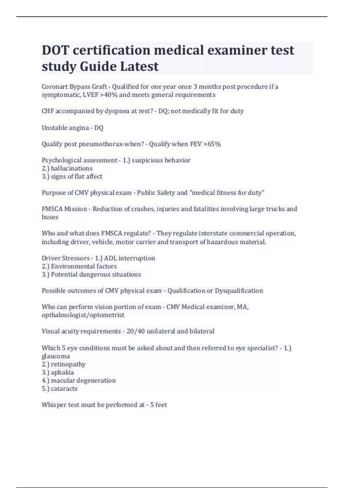 DOT certification medical examiner test study Guide Latest Coronart Bypass Graft - Qualified for one year once 3 months post procedure if a symptomatic, LVEF >40% and meets general requirements CHF accompanied by dyspnea at rest? - DQ; not medically fit for duty Unstable angina - DQ Qualify post pneumothorax-when? - Qualify when FEV >65% Psychological assessment - 1.) suspicious behavior 2.) hallucinations 3.) signs of flat affect Purpose of CMV physical exam - Public Safety and "medical fitness for duty" FMSCA Mission - Reduction of crashes, injuries and fatalities involving large trucks and buses Who and what does FMSCA regulate? - They regulate interstate commercial operation, including driver, vehicle, motor carrier and transport of hazardous material. Driver Stressors - 1.) ADL interruption 2.) Environmental factors 3.) Potential dangerous situations Possible outcomes of CMV physical exam - Qualification or Dysqualification Who can perform vision portion of exam - CMV Medical examiner, MA, opthalmologist/optometrist Visual acuity requirements - 20/40 unilateral and bilateral Which 5 eye conditions must be asked about and then referred to eye specialist? - 1.) glaucoma 2.) retinopathy 3.) aphakia 4.) macular degeneration 5.) cataracts Whisper test must be performed at - 5 feet Time post MI prior to driving - 2 months and meets all other PE requirements Minimum LVEF - 40% Maximum size abdominal aortic aneurysm - 5 cm Stage I HTN - 140-159/90-99 Minimum PaO2 below 5000 ft - 65 Minimum PaO2 above 5000 ft - 60 Minimum FEV1 requirement - 65% Minimum time lapse after taking sedating medication - 12 hours Minimum FVC - 65% History of two pneumothorax without surgical repair - DQ Qualification for CMV with loss of limb - May with SPE according to 49 CFR 391.49 Someone using insulin may be qualifed - Yes, but only with a Federal Diabetes Exemption Which of the following is evaluated in the eye - Pupil reactivity-this is a cranial nerve test Minimum pulse oximetry - 92% Vision regulation - CFR 391.41(b)(10)