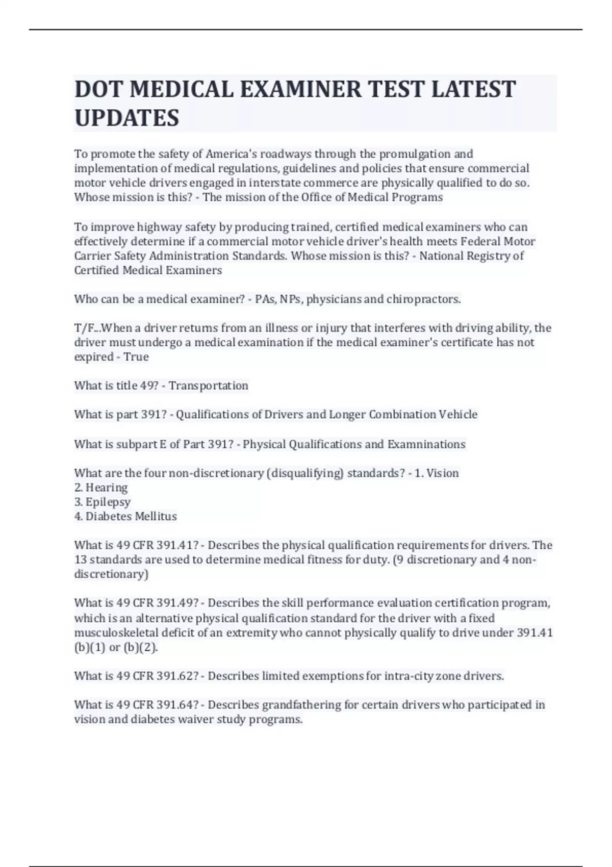DOT MEDICAL EXAMINER TEST LATEST UPDATES To promote the safety of America's roadways through the promulgation and implementation of medical regulations, guidelines and policies that ensure commercial motor vehicle drivers engaged in interstate commerce are physically qualified to do so. Whose mission is this? - The mission of the Office of Medical Programs To improve highway safety by producing trained, certified medical examiners who can effectively determine if a commercial motor vehicle driver's health meets Federal Motor Carrier Safety Administration Standards. Whose mission is this? - National Registry of Certified Medical Examiners Who can be a medical examiner? - PAs, NPs, physicians and chiropractors. T/F...When a driver returns from an illness or injury that interferes with driving ability, the driver must undergo a medical examination if the medical examiner's certificate has not expired - True What is title 49? - Transportation What is part 391? - Qualifications of Drivers and Longer Combination Vehicle What is subpart E of Part 391? - Physical Qualifications and Examninations What are the four non-discretionary (disqualifying) standards? - 1. Vision 2. Hearing 3. Epilepsy 4. Diabetes Mellitus What is 49 CFR 391.41? - Describes the physical qualification requirements for drivers. The 13 standards are used to determine medical fitness for duty. (9 discretionary and 4 non-discretionary) What is 49 CFR 391.49? - Describes the skill performance evaluation certification program, which is an alternative physical qualification standard for the driver with a fixed musculoskeletal deficit of an extremity who cannot physically qualify to drive under 391.41 (b)(1) or (b)(2). What is 49 CFR 391.62? - Describes limited exemptions for intra-city zone drivers. What is 49 CFR 391.64? - Describes grandfathering for certain drivers who participated in vision and diabetes waiver study programs. What is an exemption? - An exemption provides temporary relief from one or more of the FMCSRs for commercial drivers. Relief from a regulation is for 2 years and may be renewed. Currently the FMSCA has two medical Driver Exemption Programs. What are they? - 1. Federal Vision Exemption Program (1998) 2. Diabetes Exemption Program (September 2003) T/F The medical examiner cannot issue an exemption - True T/F Both federal exemptions require the driver to have an annual medical examination for maintenance and renewal of the exemption. - True What is 49 CFR 391.43? - Certificate of physical examination. Describes your responsibilities as a FMCSA medical examiner. What is the purpose of Interstate Commercial Driver Physical Examination? - As a medical examiner, your fundamental obligation is to establish whether a driver has a disease, disorder, or injury resulting in a higher than acceptable likelihood for gradual or sudden incapacitation or sudden death, thus endangering public safety. When conducting a physical examination to determine if the driver is medically fit to perform the job of commercial driving, you must consider what 3 things? - 1. Physical condition 2. Mental condition 3. Medical treatment How do you distinguish between medical standards (49 CFR 391.41) and medical guidelines? - Regulations/standards are laws and must be followed. Whereas guidelines, such as advisory criteria and medical conference reports are recommendations. T/F A complete physical examination is required for new certification and recertification - True If a driver is on dialysis can they be certified? - No What is the maximum amount of time you can certify a driver? - 2 years How long do you retain the driver medical records for? - 3 years What is 49 CFR 391.41 (b) (10)? - Vision What qualifies for vision? - Has distant visual acuity of at least 20/40 (Snellen) in each eye without corrective lenses or visual acuity separately corrected to 20/40 (Snellen) or better with corrective lenses, distant binocular acuity of at least 20/40 (Snellen) in both eyes with or without corrective lenses, field of vision of at least 70 degrees in the horizontal median in each eye, and the ability to recognize the colors of traffic signals and devices showing standard red, green, and amber. T/F Monocular vision is disqualifying - True