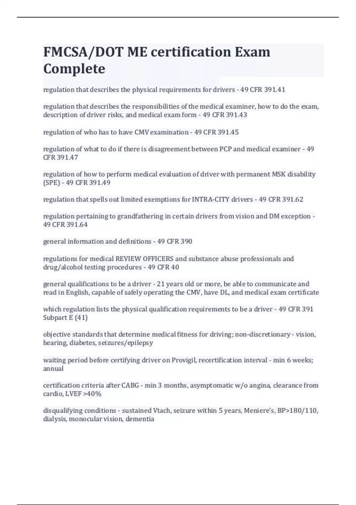 FMCSA/DOT ME certification Exam Complete regulation that describes the physical requirements for drivers - 49 CFR 391.41 regulation that describes the responsibilities of the medical examiner, how to do the exam, description of driver risks, and medical exam form - 49 CFR 391.43 regulation of who has to have CMV examination - 49 CFR 391.45 regulation of what to do if there is disagreement between PCP and medical examiner - 49 CFR 391.47 regulation of how to perform medical evaluation of driver with permanent MSK disability (SPE) - 49 CFR 391.49 regulation that spells out limited exemptions for INTRA-CITY drivers - 49 CFR 391.62 regulation pertaining to grandfathering in certain drivers from vision and DM exception - 49 CFR 391.64 general information and definitions - 49 CFR 390 regulations for medical REVIEW OFFICERS and substance abuse professionals and drug/alcohol testing procedures - 49 CFR 40 general qualifications to be a driver - 21 years old or more, be able to communicate and read in English, capable of safely operating the CMV, have DL, and medical exam certificate which regulation lists the physical qualification requirements to be a driver - 49 CFR 391 Subpart E (41) objective standards that determine medical fitness for driving; non-discretionary - vision, hearing, diabetes, seizures/epilepsy waiting period before certifying driver on Provigil, recertification interval - min 6 weeks; annual certification criteria after CABG - min 3 months, asymptomatic w/o angina, clearance from cardio, LVEF >40% disqualifying conditions - sustained Vtach, seizure within 5 years, Meniere's, BP>180/110, dialysis, monocular vision, dementia what is suggested recertification interval for NIDDM - 1 year disqualifying medications - controlled meds, methadone, habit forming drugs including narcotics and amphetamines, anti-seizure meds, medical marijuana, benzos, phenothiazines rules that establish national registry of certified MEs - 49 CFR 390 Subpart D (101-115) required components of urinalysis - spec gravity, protein, blood, glucose disqualifying neuromuscular diseases - myotonia, isaac's syndr (neuromyotonia), stiff man syndr myotonia - inability to relax muscle after vigorous activity stiff man syndrome - truncal rigidity, spasms resulting in postural deformities who can grant the SPE certificate - FMCSA what is monocular vision - meeting the 20/40 requirement in only one eye symptom free period before driver can be certified if had acute BPV or acute/chronic peripheral vestibulopathy - 2 months disqualifying ear problems - meniere's, nonfunctional labyrinth, labyrinthine fistula, uncontrolled vertigo