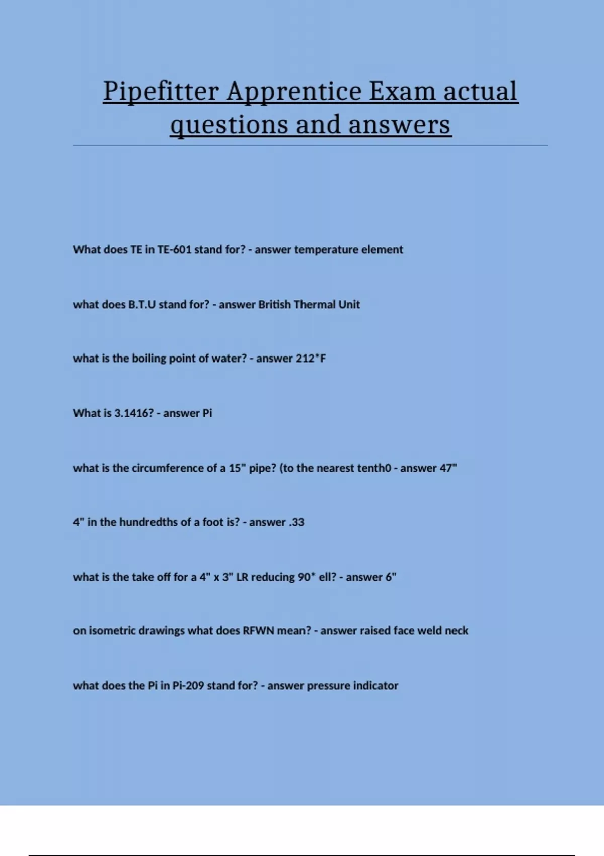 Pipefitter Apprentice Exam actual questions and answers.