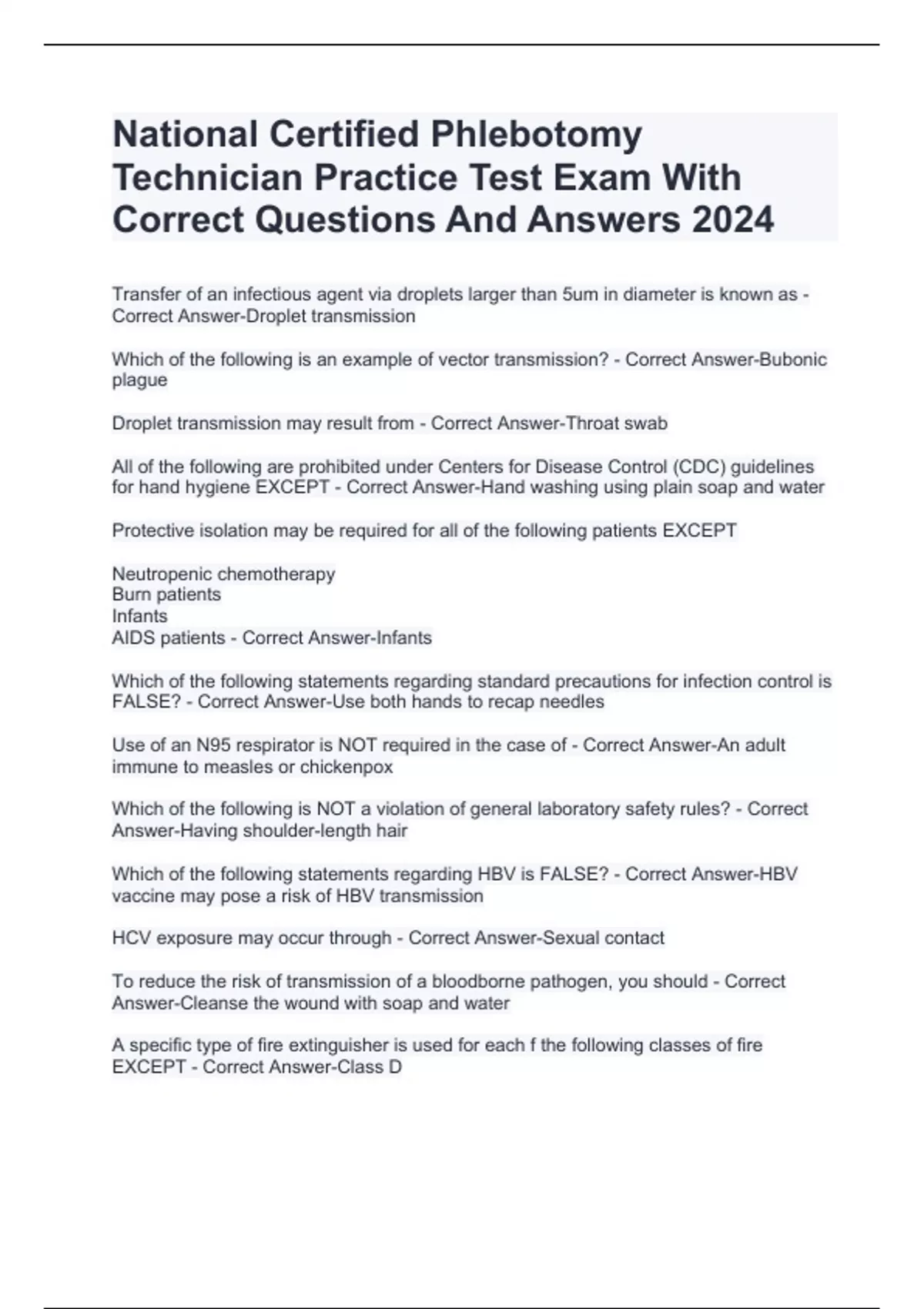 National Certified Phlebotomy Technician Practice Test Exam With Correct Questions And Answers 2024