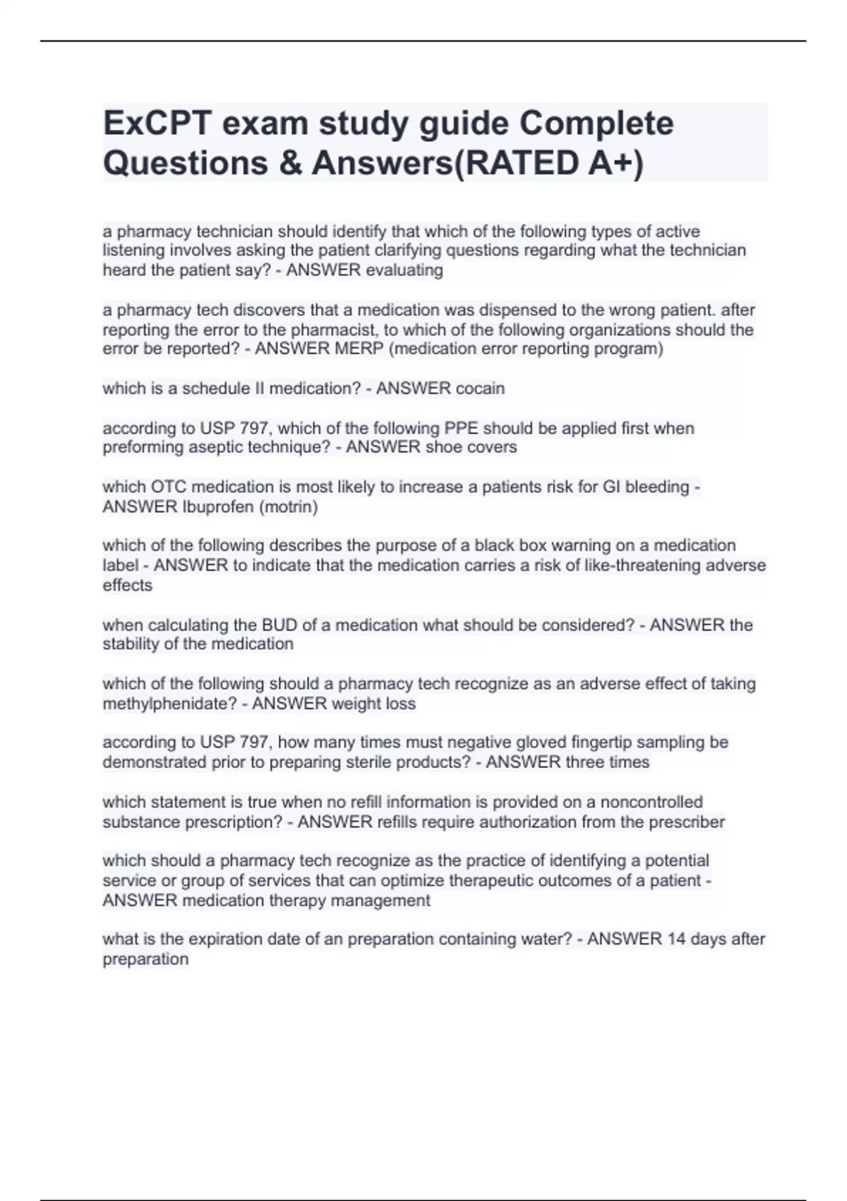 a pharmacy technician should identify that which of the following types of active listening involves asking the patient clarifying questions regarding what the technician heard the patient say? - ANSWER evaluating a pharmacy tech discovers that a medication was dispensed to the wrong patient. after reporting the error to the pharmacist, to which of the following organizations should the error be reported? - ANSWER MERP (medication error reporting program) which is a schedule II medication? - ANSWER cocain according to USP 797, which of the following PPE should be applied first when preforming aseptic technique? - ANSWER shoe covers which OTC medication is most likely to increase a patients risk for GI bleeding - ANSWER Ibuprofen (motrin) which of the following describes the purpose of a black box warning on a medication label - ANSWER to indicate that the medication carries a risk of like-threatening adverse effects when calculating the BUD of a medication what should be considered? - ANSWER the stability of the medication which of the following should a pharmacy tech recognize as an adverse effect of taking methylphenidate? - ANSWER weight loss according to USP 797, how many times must negative gloved fingertip sampling be demonstrated prior to preparing sterile products? - ANSWER three times which statement is true when no refill information is provided on a noncontrolled substance prescription? - ANSWER refills require authorization from the prescriber which should a pharmacy tech recognize as the practice of identifying a potential service or group of services that can optimize therapeutic outcomes of a patient - ANSWER medication therapy management what is the expiration date of an preparation containing water? - ANSWER 14 days after preparation