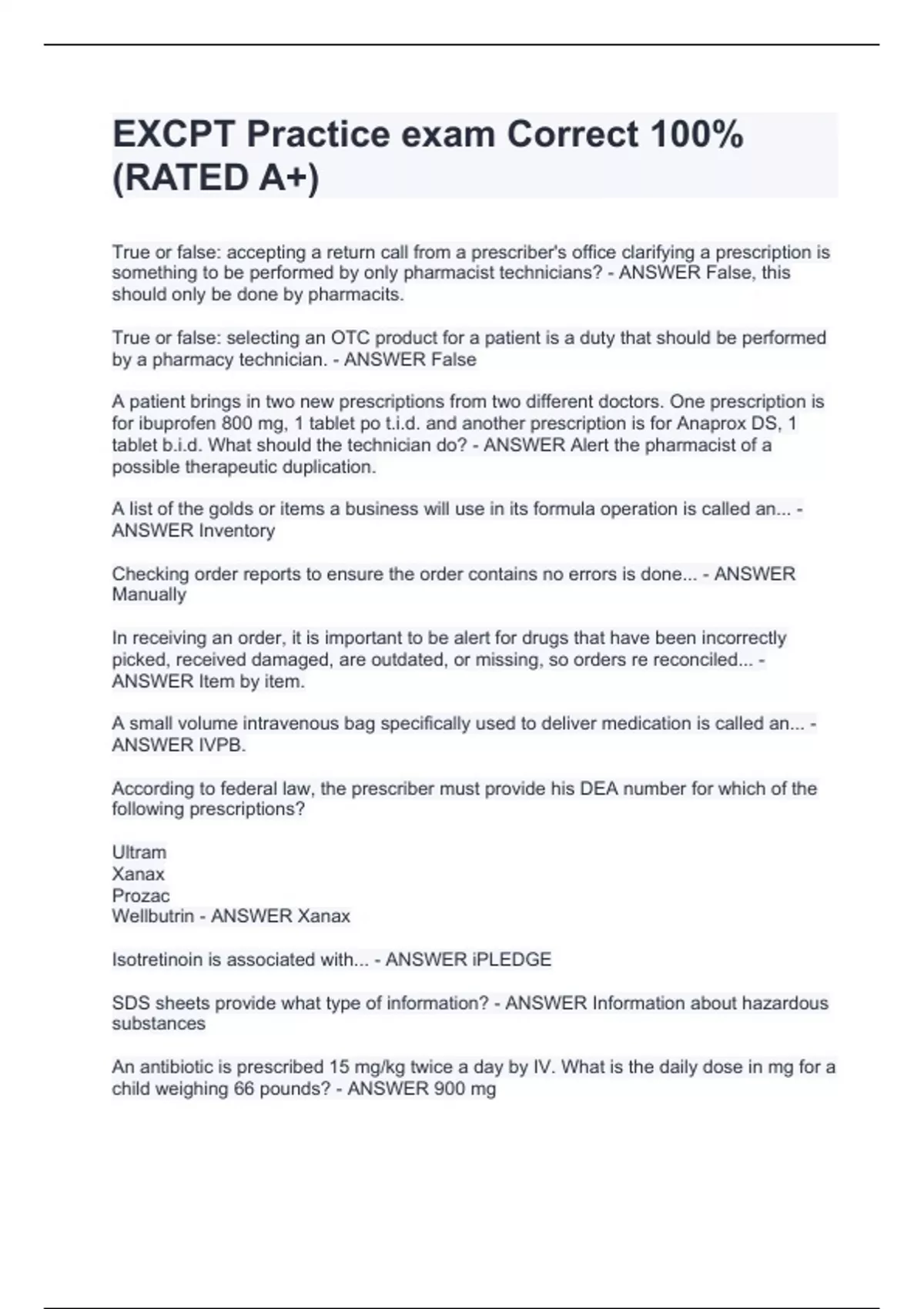 True or false: accepting a return call from a prescriber's office clarifying a prescription is something to be performed by only pharmacist technicians? - ANSWER False, this should only be done by pharmacits. True or false: selecting an OTC product for a patient is a duty that should be performed by a pharmacy technician. - ANSWER False A patient brings in two new prescriptions from two different doctors. One prescription is for ibuprofen 800 mg, 1 tablet po t.i.d. and another prescription is for Anaprox DS, 1 tablet b.i.d. What should the technician do? - ANSWER Alert the pharmacist of a possible therapeutic duplication. A list of the golds or items a business will use in its formula operation is called an... - ANSWER Inventory Checking order reports to ensure the order contains no errors is done... - ANSWER Manually In receiving an order, it is important to be alert for drugs that have been incorrectly picked, received damaged, are outdated, or missing, so orders re reconciled... - ANSWER Item by item. A small volume intravenous bag specifically used to deliver medication is called an... - ANSWER IVPB. According to federal law, the prescriber must provide his DEA number for which of the following prescriptions? Ultram Xanax Prozac Wellbutrin - ANSWER Xanax Isotretinoin is associated with... - ANSWER iPLEDGE SDS sheets provide what type of information? - ANSWER Information about hazardous substances An antibiotic is prescribed 15 mg/kg twice a day by IV. What is the daily dose in mg for a child weighing 66 pounds? - ANSWER 900 mg