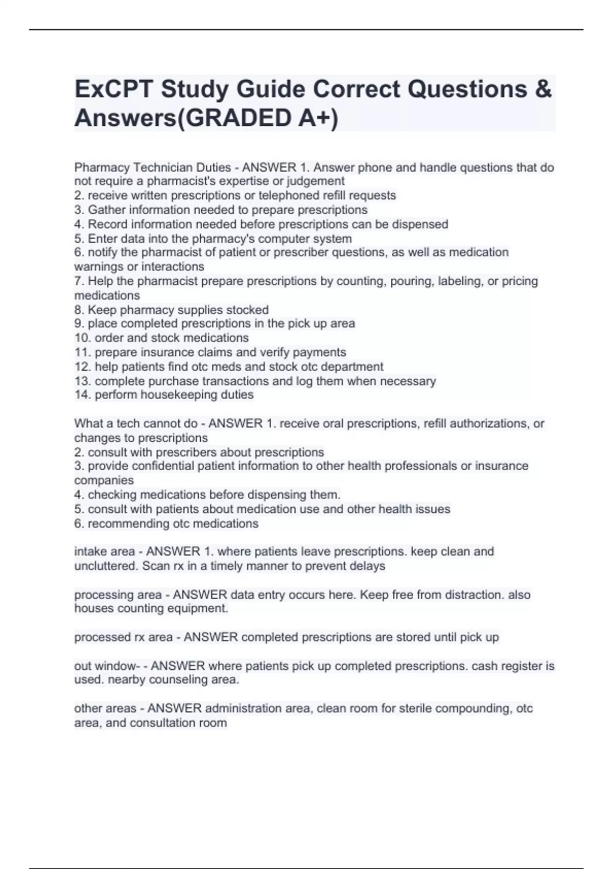 Pharmacy Technician Duties - ANSWER 1. Answer phone and handle questions that do not require a pharmacist's expertise or judgement 2. receive written prescriptions or telephoned refill requests 3. Gather information needed to prepare prescriptions 4. Record information needed before prescriptions can be dispensed 5. Enter data into the pharmacy's computer system 6. notify the pharmacist of patient or prescriber questions, as well as medication warnings or interactions 7. Help the pharmacist prepare prescriptions by counting, pouring, labeling, or pricing medications 8. Keep pharmacy supplies stocked 9. place completed prescriptions in the pick up area 10. order and stock medications 11. prepare insurance claims and verify payments 12. help patients find otc meds and stock otc department 13. complete purchase transactions and log them when necessary 14. perform housekeeping duties What a tech cannot do - ANSWER 1. receive oral prescriptions, refill authorizations, or changes to prescriptions 2. consult with prescribers about prescriptions 3. provide confidential patient information to other health professionals or insurance companies 4. checking medications before dispensing them. 5. consult with patients about medication use and other health issues 6. recommending otc medications intake area - ANSWER 1. where patients leave prescriptions. keep clean and uncluttered. Scan rx in a timely manner to prevent delays processing area - ANSWER data entry occurs here. Keep free from distraction. also houses counting equipment. processed rx area - ANSWER completed prescriptions are stored until pick up out window- - ANSWER where patients pick up completed prescriptions. cash register is used. nearby counseling area. other areas - ANSWER administration area, clean room for sterile compounding, otc