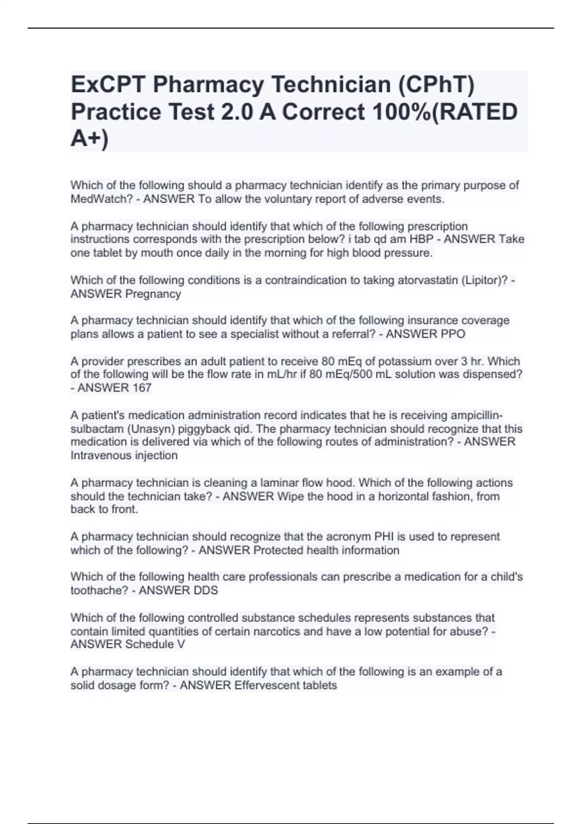 ExCPT Pharmacy Technician (CPhT) Practice Test 2.0 A Correct 100%(RATED A+)
