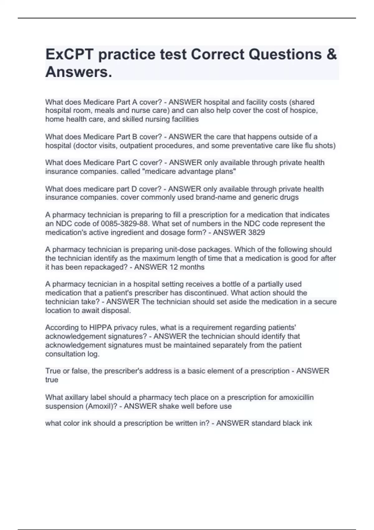 What does Medicare Part A cover? - ANSWER hospital and facility costs (shared hospital room, meals and nurse care) and can also help cover the cost of hospice, home health care, and skilled nursing facilities What does Medicare Part B cover? - ANSWER the care that happens outside of a hospital (doctor visits, outpatient procedures, and some preventative care like flu shots) What does Medicare Part C cover? - ANSWER only available through private health insurance companies. called "medicare advantage plans" What does medicare part D cover? - ANSWER only available through private health insurance companies. cover commonly used brand-name and generic drugs A pharmacy technician is preparing to fill a prescription for a medication that indicates an NDC code of . What set of numbers in the NDC code represent the medication's active ingredient and dosage form? - ANSWER 3829 A pharmacy technician is preparing unit-dose packages. Which of the following should the technician identify as the maximum length of time that a medication is good for after it has been repackaged? - ANSWER 12 months A pharmacy tecnician in a hospital setting receives a bottle of a partially used medication that a patient's prescriber has discontinued. What action should the technician take? - ANSWER The technician should set aside the medication in a secure location to await disposal. According to HIPPA privacy rules, what is a requirement regarding patients' acknowledgement signatures? - ANSWER the technician should identify that acknowledgement signatures must be maintained separately from the patient consultation log. True or false, the prescriber's address is a basic element of a prescription - ANSWER true What axillary label should a pharmacy tech place on a prescription for amoxicillin suspension (Amoxil)? - ANSWER shake well before use what color ink should a prescription be written in? - ANSWER standard black ink what organization should be contacted if a pharmacy tech receives a delivery of medications that appear to be counterfeit (according to the Drug Supply Chain Security Act)? - ANSWER FDA (contact within 24 hr if a med appears to be counterfeit)