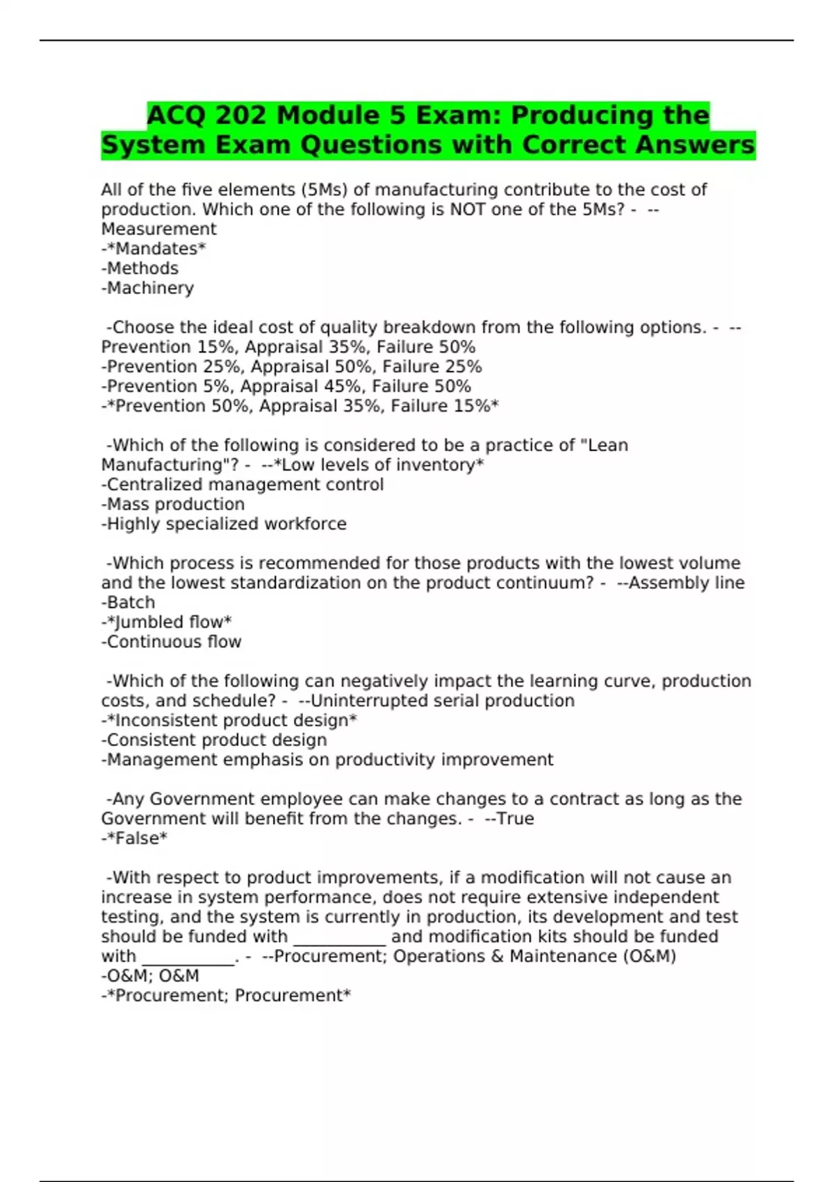 ACQ 202 Module 5 Exam: Producing the System Exam Questions with Correct Answers