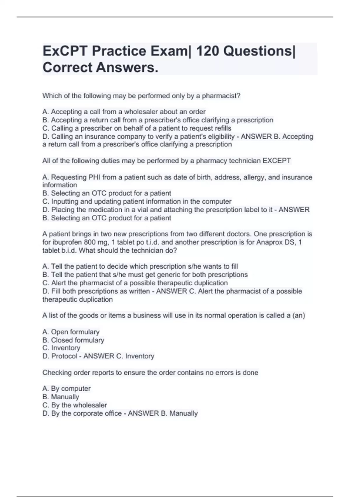 Which of the following may be performed only by a pharmacist? A. Accepting a call from a wholesaler about an order B. Accepting a return call from a prescriber's office clarifying a prescription C. Calling a prescriber on behalf of a patient to request refills D. Calling an insurance company to verify a patient's eligibility - ANSWER B. Accepting a return call from a prescriber's office clarifying a prescription All of the following duties may be performed by a pharmacy technician EXCEPT A. Requesting PHI from a patient such as date of birth, address, allergy, and insurance information B. Selecting an OTC product for a patient C. Inputting and updating patient information in the computer D. Placing the medication in a vial and attaching the prescription label to it - ANSWER B. Selecting an OTC product for a patient A patient brings in two new prescriptions from two different doctors. One prescription is for ibuprofen 800 mg, 1 tablet po t.i.d. and another prescription is for Anaprox DS, 1 tablet b.i.d. What should the technician do? A. Tell the patient to decide which prescription s/he wants to fill B. Tell the patient that s/he must get generic for both prescriptions C. Alert the pharmacist of a possible therapeutic duplication D. Fill both prescriptions as written - ANSWER C. Alert the pharmacist of a possible therapeutic duplication A list of the goods or items a business will use in its normal operation is called a (an) A. Open formulary B. Closed formulary C. Inventory D. Protocol - ANSWER C. Inventory Checking order reports to ensure the order contains no errors is done