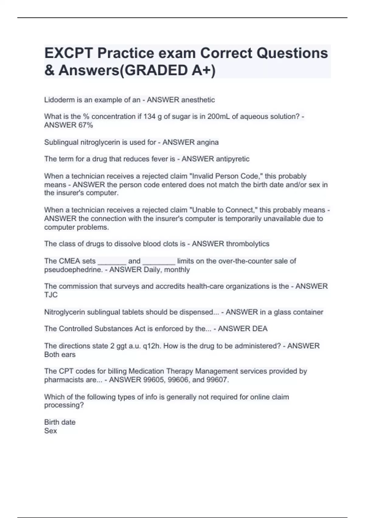 Lidoderm is an example of an - ANSWER anesthetic What is the % concentration if 134 g of sugar is in 200mL of aqueous solution? - ANSWER 67% Sublingual nitroglycerin is used for - ANSWER angina The term for a drug that reduces fever is - ANSWER antipyretic When a technician receives a rejected claim "Invalid Person Code," this probably means - ANSWER the person code entered does not match the birth date and/or sex in the insurer's computer. When a technician receives a rejected claim "Unable to Connect," this probably means - ANSWER the connection with the insurer's computer is temporarily unavailable due to computer problems. The class of drugs to dissolve blood clots is - ANSWER thrombolytics The CMEA sets _______ and ________ limits on the over-the-counter sale of pseudoephedrine. - ANSWER Daily, monthly The commission that surveys and accredits health-care organizations is the - ANSWER TJC Nitroglycerin sublingual tablets should be dispensed... - ANSWER in a glass container The Controlled Substances Act is enforced by the... - ANSWER DEA The directions state 2 ggt a.u. q12h. How is the drug to be administered? - ANSWER Both ears The CPT codes for billing Medication Therapy Management services provided by pharmacists are... - ANSWER 99605, 99606, and 99607. Which of the following types of info is generally not required for online claim processing? Birth date Sex Group number Height - ANSWER Height