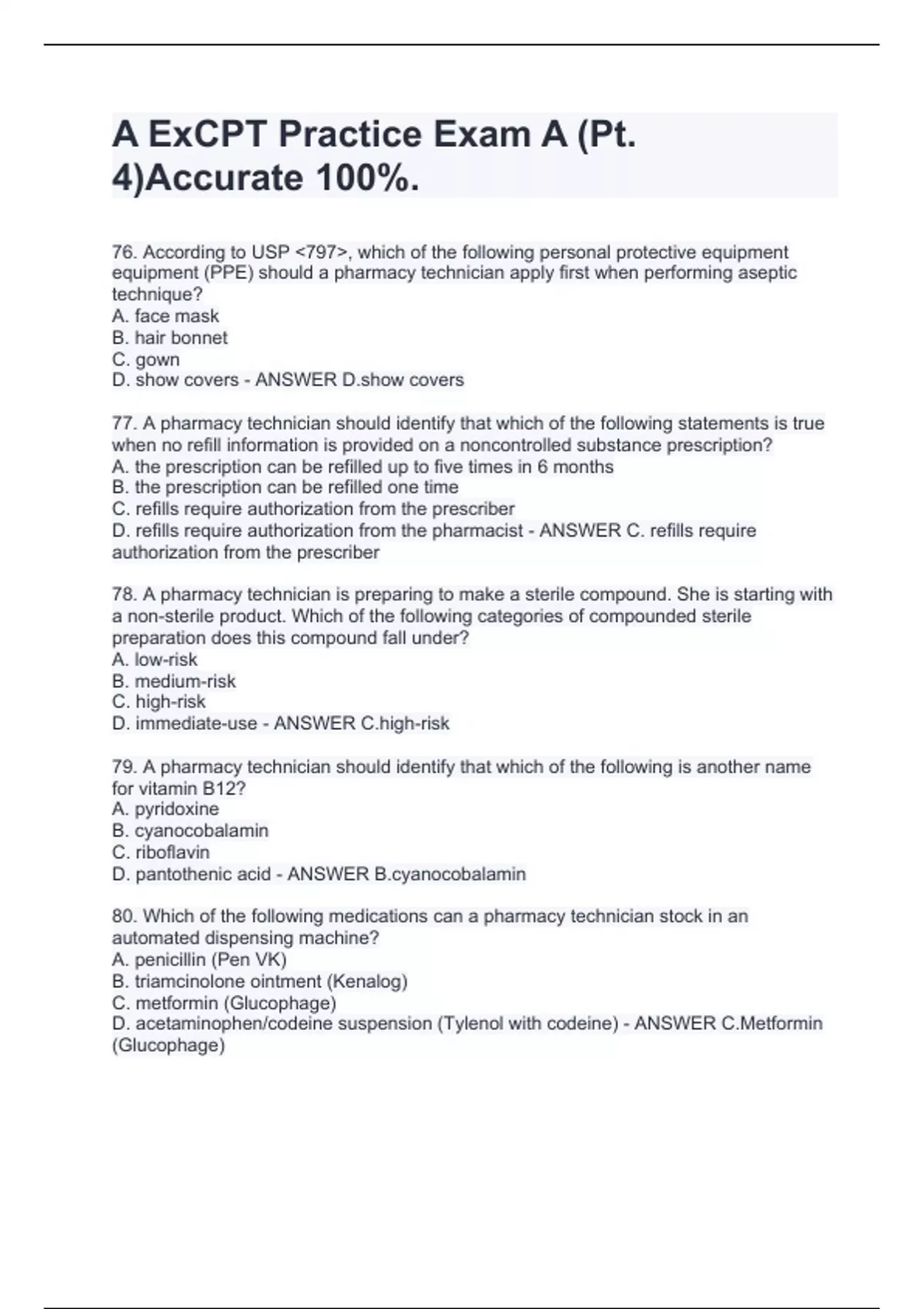 76. According to USP <797>, which of the following personal protective equipment equipment (PPE) should a pharmacy technician apply first when performing aseptic technique? A. face mask B. hair bonnet C. gown D. show covers - ANSWER D.show covers 77. A pharmacy technician should identify that which of the following statements is true when no refill information is provided on a noncontrolled substance prescription? A. the prescription can be refilled up to five times in 6 months B. the prescription can be refilled one time C. refills require authorization from the prescriber D. refills require authorization from the pharmacist - ANSWER C. refills require authorization from the prescriber 78. A pharmacy technician is preparing to make a sterile compound. She is starting with a non-sterile product. Which of the following categories of compounded sterile preparation does this compound fall under? A. low-risk B. medium-risk C. high-risk D. immediate-use - ANSWER C.high-risk 79. A pharmacy technician should identify that which of the following is another name for vitamin B12? A. pyridoxine B. cyanocobalamin C. riboflavin D. pantothenic acid - ANSWER B.cyanocobalamin 80. Which of the following medications can a pharmacy technician stock in an automated dispensing machine? A. penicillin (Pen VK) B. triamcinolone ointment (Kenalog) C. metformin (Glucophage) D. acetaminophen/codeine suspension (Tylenol with codeine) - ANSWER C.Metformin (Glucophage)