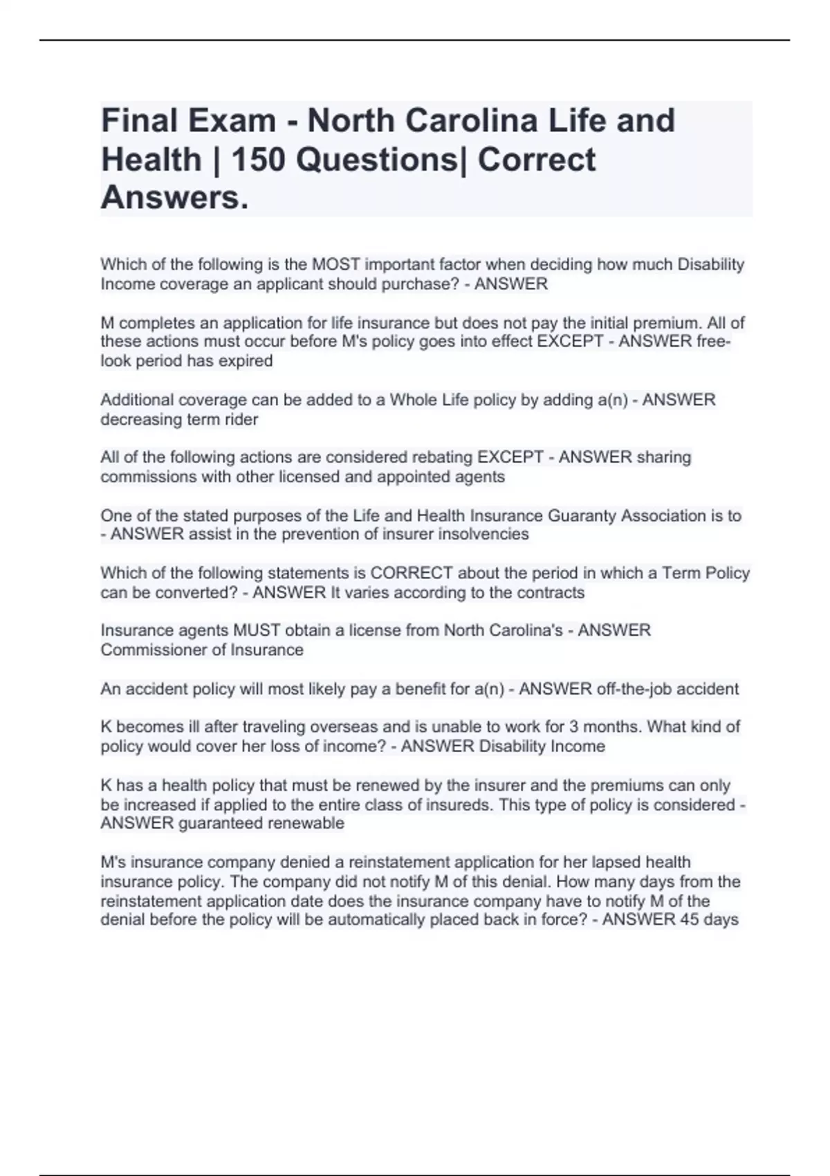 Final Exam - North Carolina Life and Health | 150 Questions| Correct Answers.