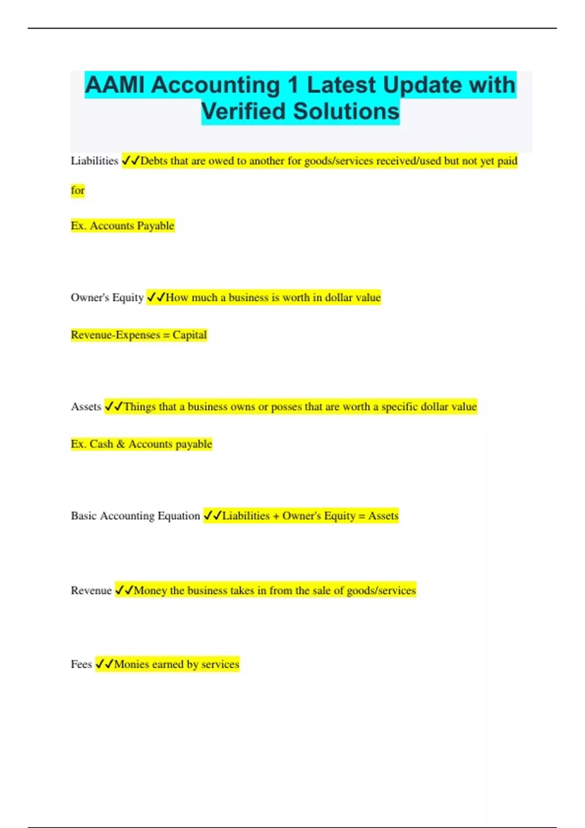 AAMI Accounting 1 Latest Update with Verified Solutions Liabilities Debts that are owed to another for goods/services received/used but not yet paid for Ex. Accounts Payable Owner's Equity How much a business is worth in dollar value Revenue-Expenses = Capital Assets Things that a business owns or posses that are worth a specific dollar value Ex. Cash & Accounts payable Basic Accounting Equation Liabilities + Owner's Equity = Assets Revenue Money the business takes in from the sale of goods/services Fees Monies earned by services Expense Cost associated with doing business Net Profit When revenue exceeds expenses ^Gross Profit - Expenses = Net Profit Net Loss When expenses exceeds revenue Gross Profit - ^Expenses = Net Loss Gross Profit Equation Revenue - Cost of Goods = Gross Profit Capital Money invested into the business by the owner using their own funds Withdrawal Money an owner takes back out of the business for personal use/to pay themselves back Expanded Accounting Equation Liabilities + Capital In - Withdrawals + Revenue - Expenses = Assets Owner's Equity Equation (Capital in - Withdrawals) + (Revenue - Expenses) Double Entry Every transaction requires at least one debit and one credit to be affected Increases to Assets & Expenses Debits Increases to Liabilities, Capital & Revenue Credits
