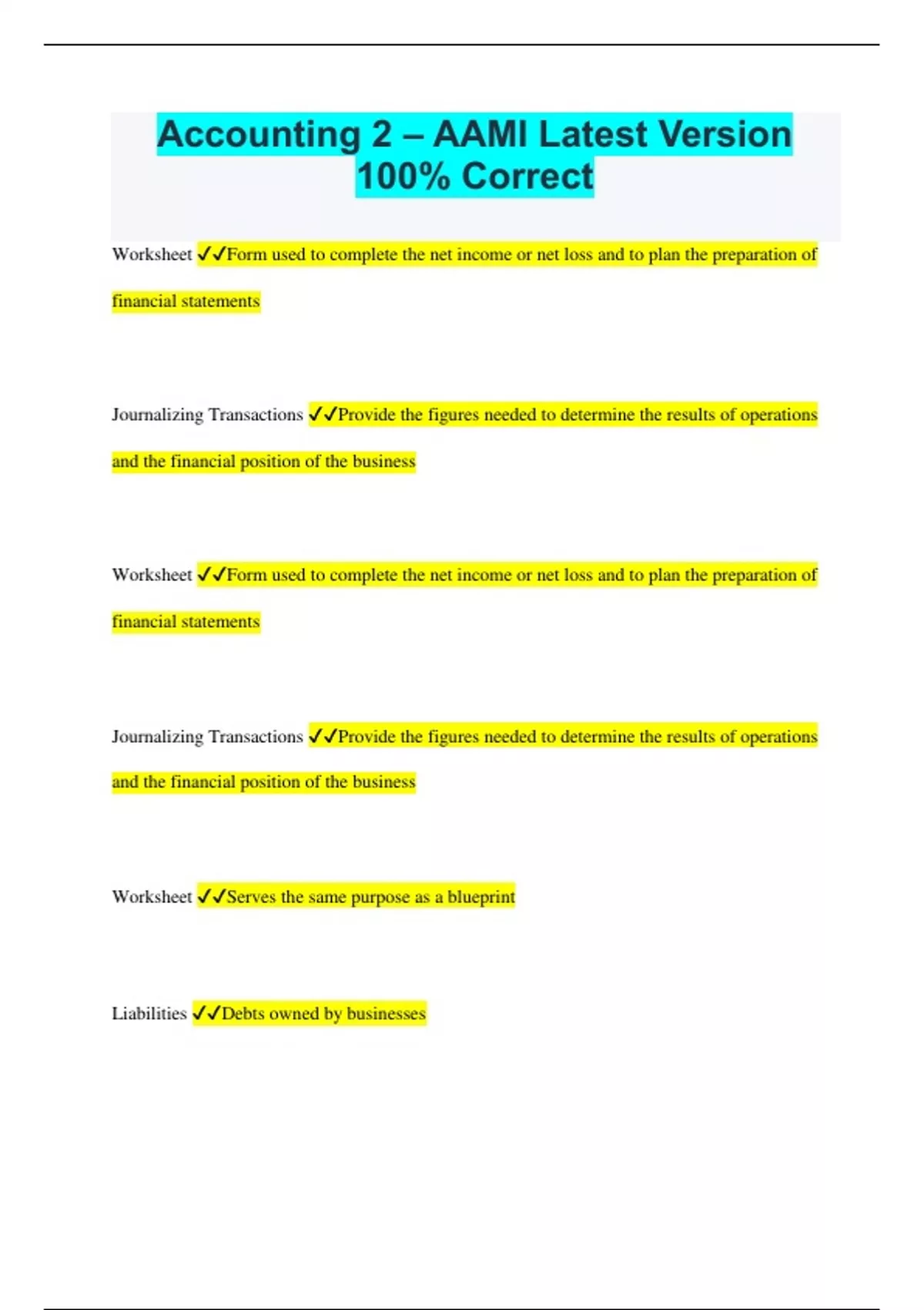 Accounting 2 – AAMI Latest Version 100% Correct Worksheet Form used to complete the net income or net loss and to plan the preparation of financial statements Journalizing Transactions Provide the figures needed to determine the results of operations and the financial position of the business Worksheet Form used to complete the net income or net loss and to plan the preparation of financial statements Journalizing Transactions Provide the figures needed to determine the results of operations and the financial position of the business Worksheet Serves the same purpose as a blueprint Liabilities Debts owned by businesses Accounts Payable Short term debts owed for credit purchases TRUE Mortgages Payable are a liability TRUE Loans Payable are a Liability T/F Assets Property a Business owns Investment Assets used in the business that were privided by the owner are? Notes Payable Dvidends Payable, Salries Payable, What are some common liabilities? Owners Equity Financial Interest of the owner in the business is called? Assets = Liabilities + Owner's Equity What is the Basic Accounting Equation? Balance Sheet Itemized list of assets, liabilites, and owners equity is__________? Balance Sheet What provides a finaincial snapshot of the business on a specific date? What are the 3 things needed at the top of a financial statement like a Balance Sheet? Business name,name of the statement, and the date Left side On what side are assets listed?