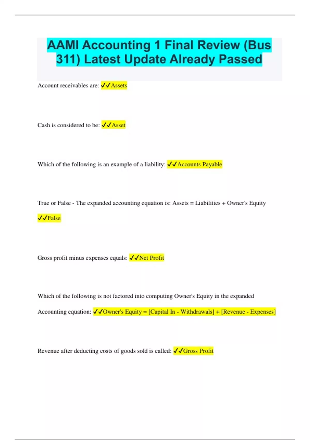 AAMI Accounting 1 Final Review (Bus 311) Latest Update Already Passed