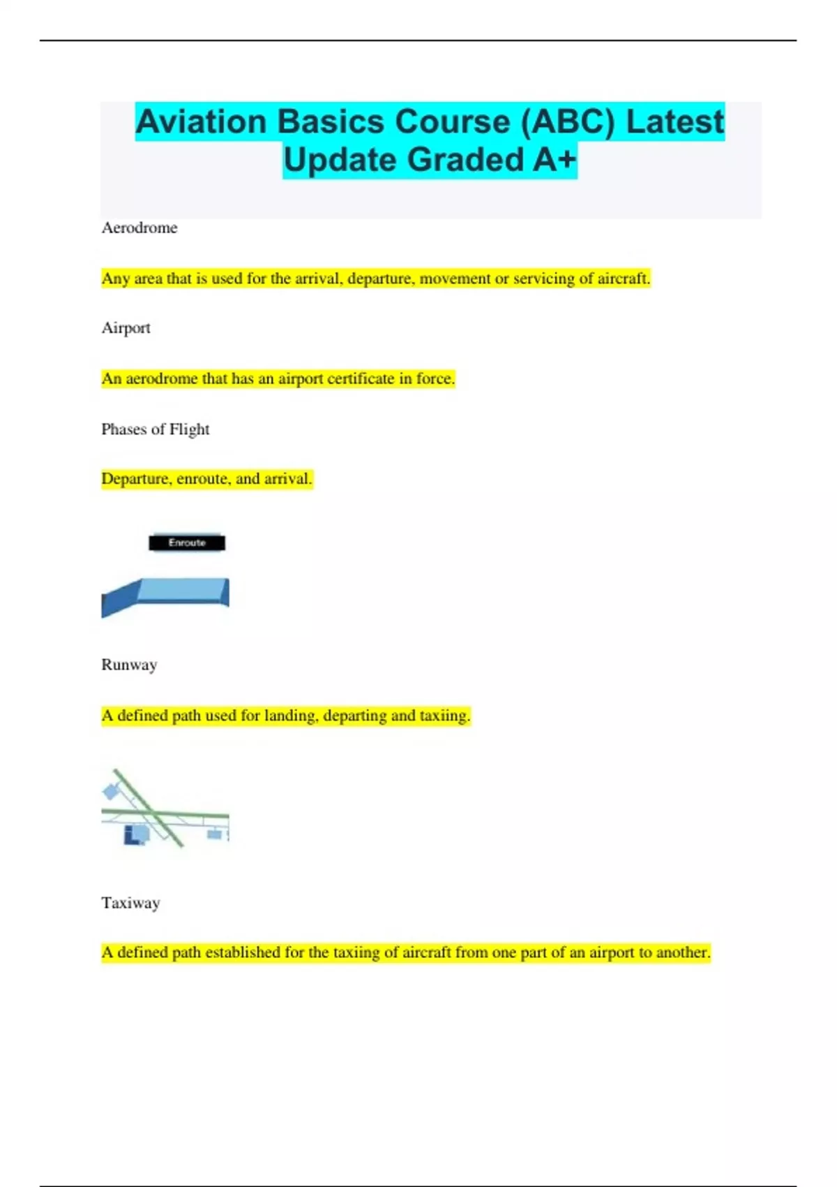 Aviation Basics Course (ABC) Latest Update Graded A+ Aerodrome Any area that is used for the arrival, departure, movement or servicing of aircraft. Airport An aerodrome that has an airport certificate in force. Phases of Flight Departure, enroute, and arrival. Runway A defined path used for landing, departing and taxiing. Taxiway A defined path established for the taxiing of aircraft from one part of an airport to another. Apron A part of the airport intended to accommodate the loading and unloading of passengers and cargo; the refuelling, servicing, maintenance and parking of aircraft; and any movement of aircraft, vehicles, and pedestrians. Intersection Any point where any combination of runways and taxiways cross such as: - two runways, - a runway and a taxiway, or - two taxiways. Manoeuvring Area Used for the take-off, landing, and taxiing of aircraft, excluding aprons. Helipad An area, usually with a prepared surface, used solely for the takeoff, landing, or parking of helicopters. Can be on apron or separate. Movement Area That part of an aerodrome to be used for the take-off, landing and taxiing of aircraft, consisting of the manoeuvring area and the apron(s). Ground Traffic All traffic, other than aircraft, on the manoeuvring and runway protected areas, such as vehicles, equipment and personnel. Flight service specialists have the authority to: Issue instructions to vehicles only. ATC have the authority to: Issue instructions to both vehicles and aircraft. Leg A path ATC can instruct aircraft to fly. Downwind Leg Flight path parallel to the landing runway in the direction opposite to landing (normally extends between the crosswind leg and the base leg). Base Leg Flight path extending from the end of the downwind leg to the extended centreline of the approach end of the landing runway.