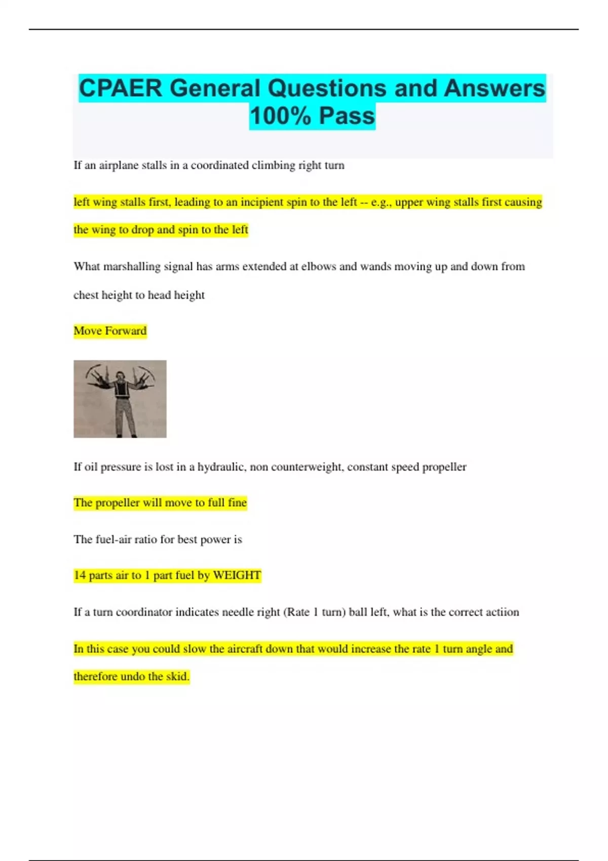 CPAER General Questions and Answers 100% Pass If an airplane stalls in a coordinated climbing right turn left wing stalls first, leading to an incipient spin to the left -- e.g., upper wing stalls first causing the wing to drop and spin to the left What marshalling signal has arms extended at elbows and wands moving up and down from chest height to head height Move Forward If oil pressure is lost in a hydraulic, non counterweight, constant speed propeller The propeller will move to full fine The fuel-air ratio for best power is 14 parts air to 1 part fuel by WEIGHT If a turn coordinator indicates needle right (Rate 1 turn) ball left, what is the correct actiion In this case you could slow the aircraft down that would increase the rate 1 turn angle and therefore undo the skid. In a free turbine engine, are the compressor and power turbines connected? No ... this is why the exhaust of the power turbine is in the front Which enhances stability, Dihedral or washout Washout Dihedral Approaching on a 3 degree approach with a 3 bar basis, the middle bar will appear(red/white) to a wide bodied airplane and (red/white) to a small aircraft? For the large aircraft -- WHITE, for the small aircraft -- RED How many lights for each 3 bar VASIS, 2 bar Vasis, PAPI and APAPI 3 bar VASIS has 5 lights, 2 bar has 4 lights, PAPI has 4 lights and APAPI has 2 lights 2 bar VASIS, how many lights if you are on the glide-path 2, the top two or Upwind Bar will be red In high winds turning from base to final to land into the wind there will be a visual illusion of An illusion of a skid If a large aircraft takes off on a runway with less than 5 knots of crosswind, what happens to the wing vortices They remain stationary for up to several minutes How do you calculate useful load? It is Gross Weight - Basic Empty Weight With the same weight and power setting, which aircraft will have a higher cruise speed, one with forward or aft CoG Aft C of G will go faster due to less drag What are standard rate females and males Standard Weight Male Summer -- 206 Standard Weight Male Winter -- 212 Standard Weight Female Summer -- 172 Standard weight female winter -- 178 Children 2-11 -- 75 Infants -- 30 What is the best angle for maximum range Lift/Drag is maximized What is the maximum speed for lowering landing gear Vlo If you have ice on lifting and control surfaces that