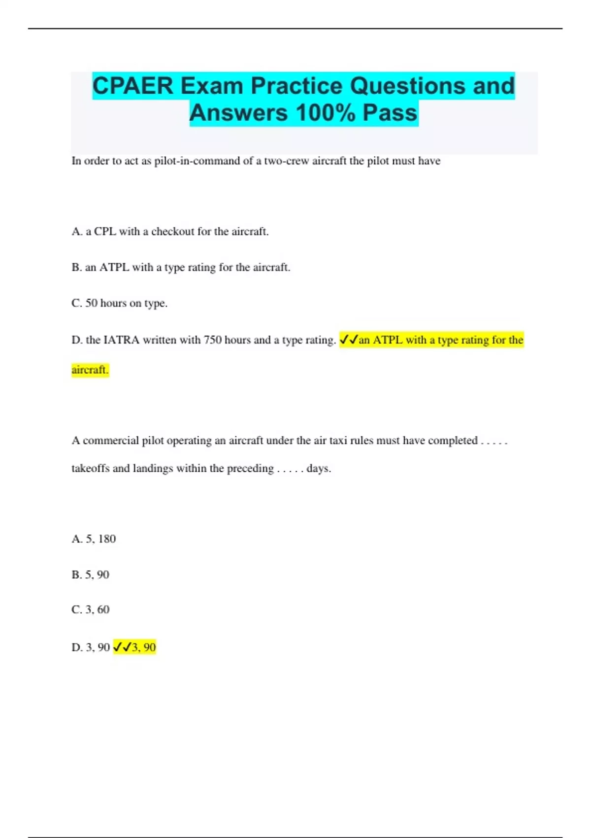 CPAER Exam Practice Questions and Answers 100% Pass In order to act as pilot-in-command of a two-crew aircraft the pilot must have A. a CPL with a checkout for the aircraft. B. an ATPL with a type rating for the aircraft. C. 50 hours on type. D. the IATRA written with 750 hours and a type rating. an ATPL with a type rating for the aircraft. A commercial pilot operating an aircraft under the air taxi rules must have completed . . . . . takeoffs and landings within the preceding . . . . . days. A. 5, 180 B. 5, 90 C. 3, 60 D. 3, 90 3, 90 A commercial pilot age 30 completed a CAT 1 medical exam on February 13, 2001 and the medical was issued on March 21, 2001. When is the last day this pilot can rent an aircraft and take a friend on a local flight? A. Last day of February 2002. B. First day of March 2002. C. First day of March 2006. D. Last day of February 2006. Last day of February 2006. In order to act as pilot-in-command of a single-engine aircraft for an air taxi service under night VFR without passengers a commercial pilot must have A. competency check. B. a valid instrument rating and PPC. C. a valid night rating and competency check. D. none of the above. competency check. To act as the pilot-in-command of a multi-engine aeroplane under IMC for an air taxi service, the pilot must have completed A. the PPC, ground and flight training initially within the preceding 12 months. B. the competency check, ground and flight training initially within the preceding 12 months. C. 5 takeoffs and landings in the preceding 6 months. D. 3 takeoffs and landings in the preceding 90 days. the PPC, ground and flight training initially within the preceding 12 months. When a pilot is operating during night VFR under the commercial air service air taxi rules in a single-engine aeroplane, passengers can A. not be carried unless authorized in the AOC. B. be carried unless not authorized in the SOP. C. only be on board if the flight is conducted with a co-pilot or the aeroplane is equipped with a working autopilot.