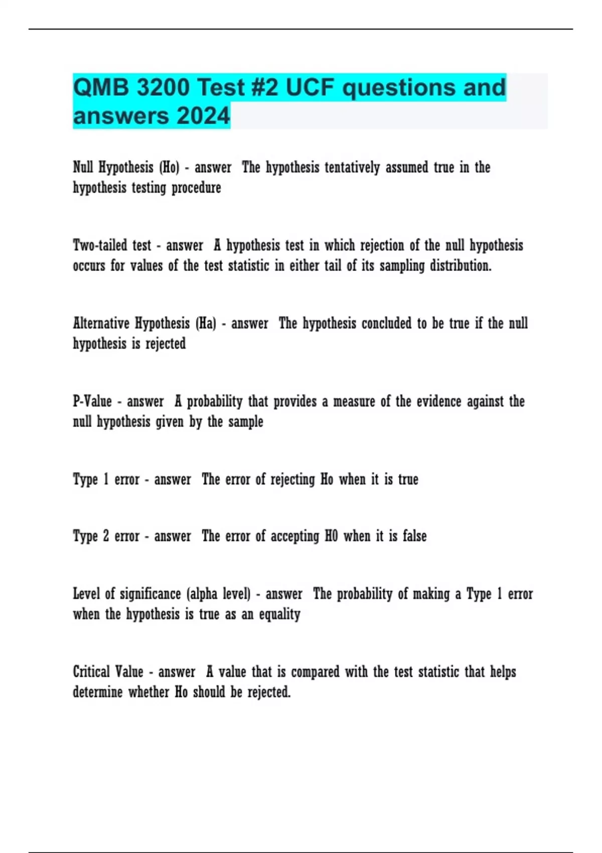 QMB 3200 Test #2 UCF questions and answers 2024.
