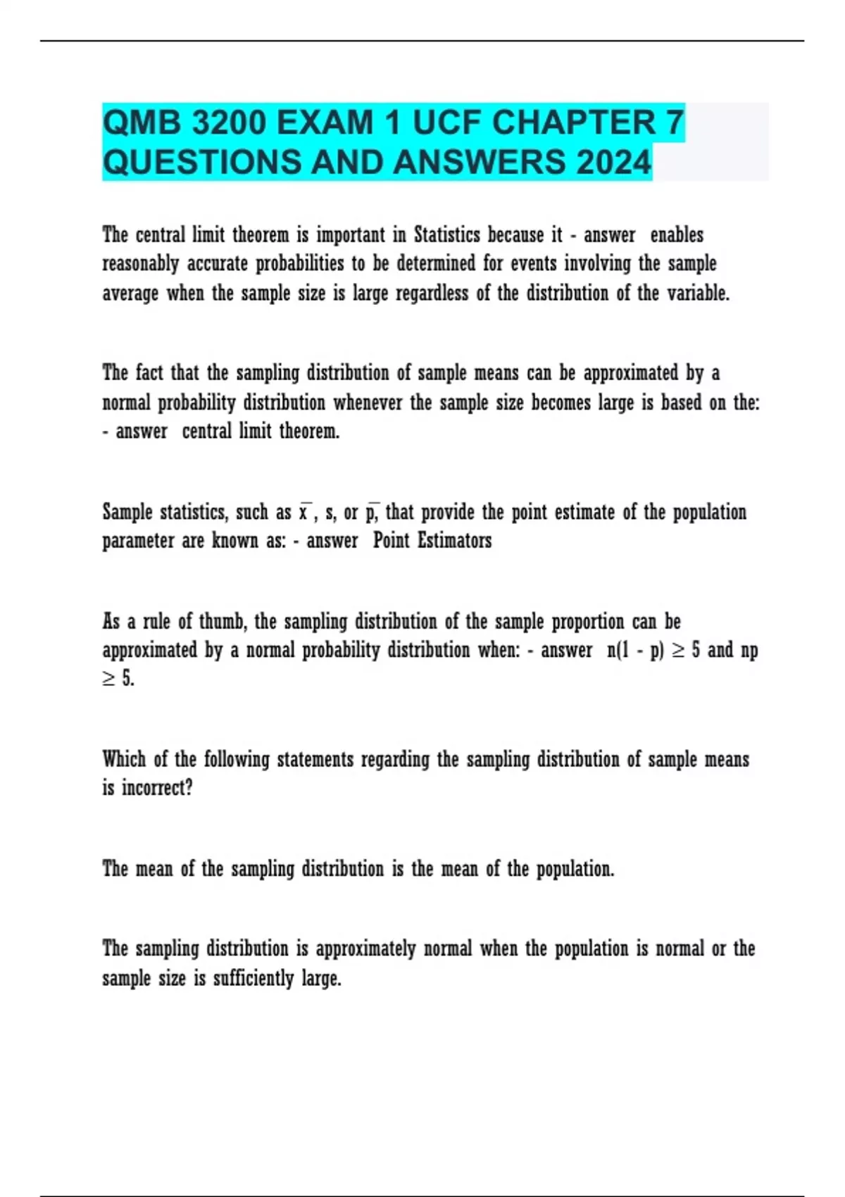 QMB 3200 EXAM 1 UCF CHAPTER 7 QUESTIONS AND ANSWERS 2024