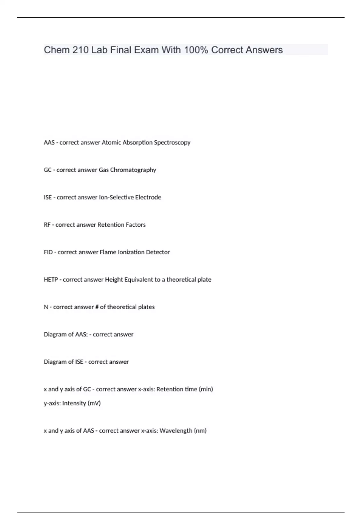 AAS - correct answer Atomic Absorption Spectroscopy GC - correct answer Gas Chromatography ISE - correct answer Ion-Selective Electrode RF - correct answer Retention Factors FID - correct answer Flame Ionization Detector HETP - correct answer Height Equivalent to a theoretical plate N - correct answer # of theoretical plates Diagram of AAS: - correct answer Diagram of ISE - correct answer x and y axis of GC - correct answer x-axis: Retention time (min) y-axis: Intensity (mV) x and y axis of AAS - correct answer x-axis: Wavelength (nm) y-axis: Absorbance