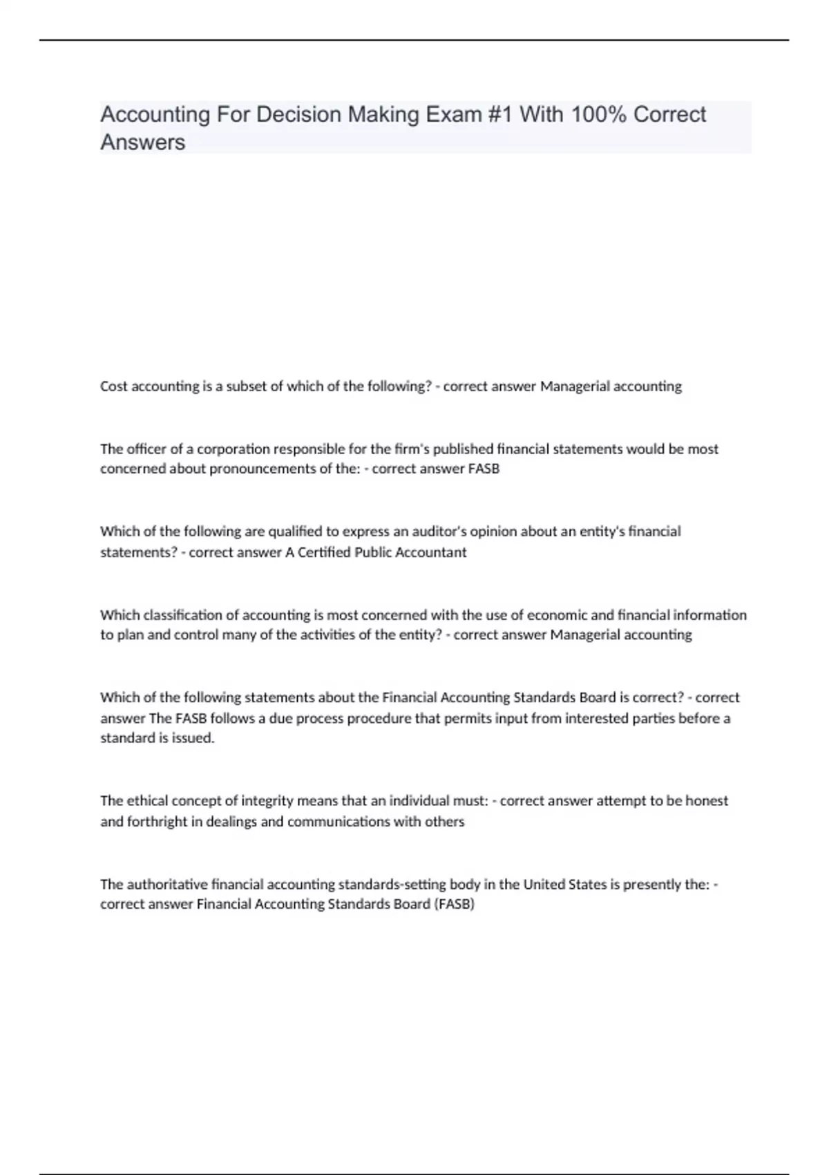 Cost accounting is a subset of which of the following? - correct answer Managerial accounting The officer of a corporation responsible for the firm's published financial statements would be most concerned about pronouncements of the: - correct answer FASB Which of the following are qualified to express an auditor's opinion about an entity's financial statements? - correct answer A Certified Public Accountant Which classification of accounting is most concerned with the use of economic and financial information to plan and control many of the activities of the entity? - correct answer Managerial accounting Which of the following statements about the Financial Accounting Standards Board is correct? - correct answer The FASB follows a due process procedure that permits input from interested parties before a standard is issued. The ethical concept of integrity means that an individual must: - correct answer attempt to be honest and forthright in dealings and communications with others The authoritative financial accounting standards-setting body in the United States is presently the: - correct answer Financial Accounting Standards Board (FASB) Which of the following is not an example of a decision or informed judgment that a potential employee could make from accounting information? - correct answer Personnel turnover statistics (i.e., hiring and terminations) Accounting can be defined as: - correct answer the process of identifying, measuring, and communicating economic information about an organization for the purpose of making decisions and informed judgments. Major classifications of accounting activity would not include: - correct answer financial accounting, national accounting, cost accounting Consolidated financial statements report financial position, results of operations, and cash flows for: - correct answer a parent corporation and its subsidiaries. Which of the following accounting methods accomplishes much of the matching of revenues and expenses? - correct answer Accrual accounting. The balance sheet equation can be represented by: - correct answer Assets - Liabilities = Stockholders' Equity, Net Assets = Stockholders' Equity, Assets = Liabilities + Stockholders' Equity The Statement of Cash Flows: - correct answer shows how cash changed during the period. Stockholders' equity refers to which of the following? - correct answer The ownership right of the stockholder(s) of the entity. The going concern concept refers to a presumption that: - correct answer the entity will continue to operate in the foreseeable future. The balance sheet might also be called: - correct answer Statement of Financial Position. The principle of consistency means that: - correct answer the effect of any change in an accounting method will be disclosed in the financial statements or notes thereto. The principle of full disclosure pertains to: - correct answer The entity fully discloses all necessary information to prevent a reasonably astute user of financial statements from being misled. The purpose of the income statement is to show the: - correct answer net income or net loss for the period covered by the statement. Financial statement ratios support informed judgments and decision making most effectively: - correct answer when the trend of entity data is compared to the trend of industry data. When comparing entity financial ratios with industry ratios: - correct answer relative values at a point in time may not be significant. Which of the following is a universally accepted measure of profitability? - correct answer Return on investment. A firm has an ROI of 15%, turnover of 3, and sales of $12 million. The firm's margin is: - correct answer 5%; 15% = ? * 3 Solve for missing number: 15% divided by 3 = 5% Return on equity: - correct answer relates net income and stockholders' equity. An advantage of the DuPont model for calculating ROI is that: - correct answer it focuses on asset utilization as well as net income. Which of the following accounts is part of working capital? - correct answer Merchandise Inventory A firm's net income for the year was $800,000. Average assets totaled $6 million, and average liabilities totaled $1.2 million. Return on equity was: - correct answer 16.7% $800,000/($6,000000 - $1,200,000) = 16.67% Another term for return on investment is: - correct answer Return on assets.