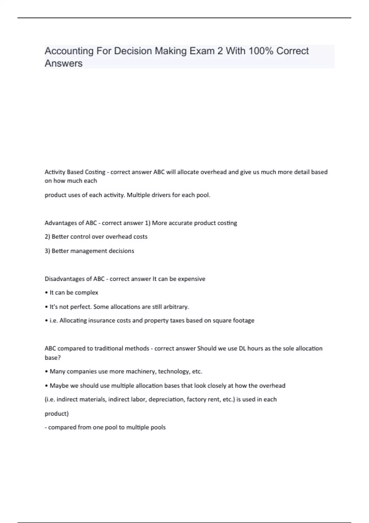 Activity Based Costing - correct answer ABC will allocate overhead and give us much more detail based on how much each product uses of each activity. Multiple drivers for each pool. Advantages of ABC - correct answer 1) More accurate product costing 2) Better control over overhead costs 3) Better management decisions Disadvantages of ABC - correct answer It can be expensive • It can be complex • It's not perfect. Some allocations are still arbitrary. • i.e. Allocating insurance costs and property taxes based on square footage ABC compared to traditional methods - correct answer Should we use DL hours as the sole allocation base? • Many companies use more machinery, technology, etc. • Maybe we should use multiple allocation bases that look closely at how the overhead (i.e. indirect materials, indirect labor, depreciation, factory rent, etc.) is used in each product) - compared from one pool to multiple pools Four steps of ABC - correct answer 1. Identify Activities 2. Identify cost drivers 3. Compute OH rates 4. Allocate costs *Will have a problem with parts 3 and 4 Value-added activities - correct answer Increase the perceived value of the product or service (design, assembly, etc.) Direct labor Non-Value-Added Activities - correct answer If eliminated, would not decrease the perceived value of the product or service (storage, internal moving costs, etc.) Indirect labor Unit activity level - correct answer costs incurred on a per-unit basis (production costs) costs go up per unit Batch activity level - correct answer costs incurred on a per batch basis (setup costs, sales orders) costs go up per setup/batch Product activity level - correct answer costs incurred on a product basis (product testing) Facility activity level - correct answer costs incurred on a facility basis (insurance, rent) fixed costs - correct answer Costs stay the same in total with each unit produced (i.e. rent, taxes, etc.) • Cost per unit will decrease with each unit produced variable costs - correct answer Costs change in total with each unit produced (i.e. DM, DL, etc.) • Cost per unit will stay the same with each unit produced relavent range - correct answer The range in which a company expects to operate • Costs are linear within the relevant range, but may not be outside the relevant range • i.e. if we produce very little, or a lot, our costs may be higher mixed costs - correct answer Part Fixed and Part Variable• U-Haul Rental ($50 per day - fixed, .50 per mile - variable) high-low method - correct answer change in total costs at high versus low activity level/high minus low activity level=unit variable costs cost behavior - correct answer Why is it important to understand cost behavior?• Sometimes costs will increase (i.e. DM costs if we produce more)• Sometimes costs will not increase (i.e. Rent if we produce more)• We need to understand how these costs will affect profitability CVP analysis - correct answer 1) Costs are linear throughout the relevant range 2) Costs are either fixed or variable (mixed are classified appropriately) 3) Changes in activity are only thing that can change costs 4) All units produced are sold 5) Sales mix will remain constant **will be a problem on exam! in units and dollars. Should be able to do all, and be able to PROVE it using contribution style income statement Contribution margin income statement - correct answer same as CVP income statement unit contribution margin