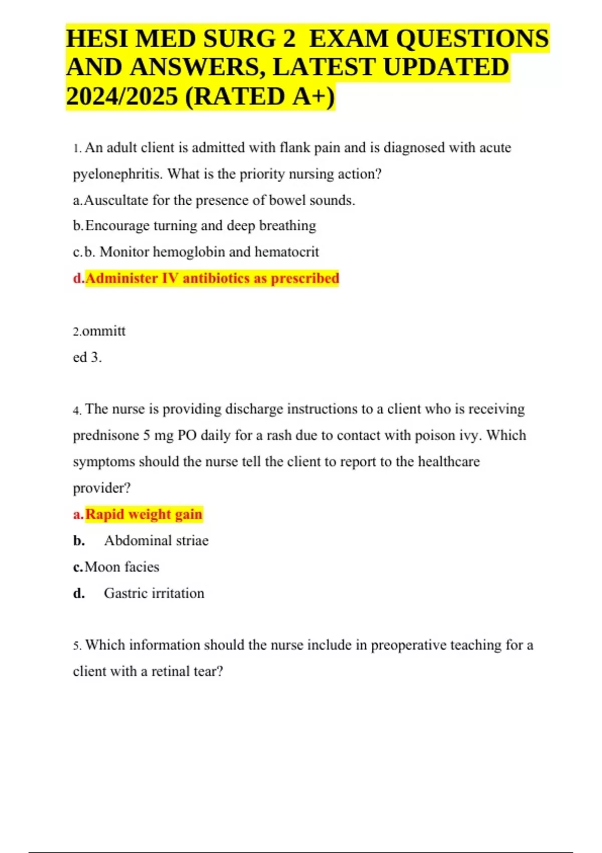 ed 3. 4. The nurse is providing discharge instructions to a client who is receiving prednisone 5 mg PO daily for a rash due to contact with poison ivy. Which symptoms should the nurse tell the client to report to the healthcare provider? a. Rapid weight gain b. Abdominal striae c. Moon facies d. Gastric irritation 5. Which information should the nurse include in preoperative teaching for a client with a retinal tear? HESI MED SURG 2 EXAM QUESTIONS AND ANSWERS, LATEST UPDATED 2024/2025 (RATED A+) a. Wear an eye patch nightly after surgery b. Lift 15-pound weights c. Avoid sewing activities d. Instill eye drops dilly before surgery. 6. A client tells the nurse that her biopsy results indicate that the cancer cells are well- differentiated. How should the nurse respond? a. Offer the client reassurance that this information indicates that the client’s cancer cells are benign b. Explain that these tissue cells often respond more effectively to radiation than to chemotherapy c. Ask the client if the healthcare provider has given her any information about the classification of her cancer d. Help the client make plans to begin immediate treatment since her cancer is likely to spread quickly 7. Which food is most important for the nurse to encourage a client with osteomalacia to include a daily diet? a. Fortified milk and cereals. b. Citrus fruits and juices. c. Green leafy vegetables. d. Red meats and eggs.
