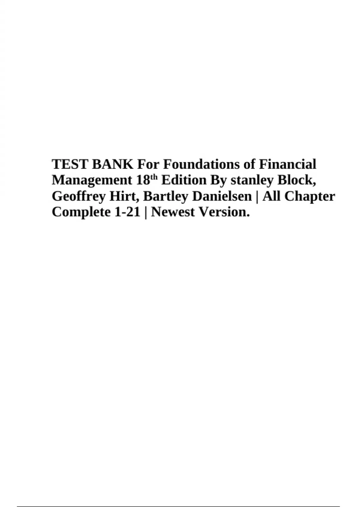 TEST BANK For Foundations of Financial Management 18th Edition By stanley Block, Geoffrey Hirt, Bartley Danielsen | All Chapter Complete 1-21 | Newest Version.