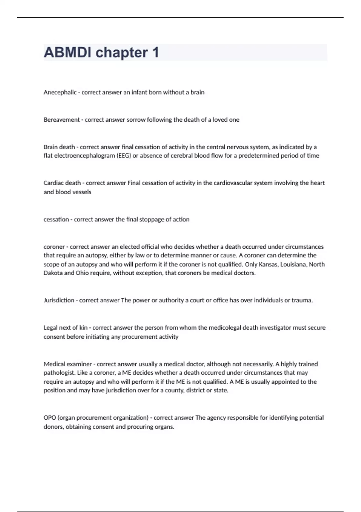 ABMDI chapter 1 Question and answers correctly solved 2024 ABMDI chapter 1 Anecephalic - correct answer an infant born without a brain Bereavement - correct answer sorrow following the death of a loved one Brain death - correct answer final cessation of activity in the central nervous system, as indicated by a flat electroencephalogram (EEG) or absence of cerebral blood flow for a predetermined period of time Cardiac death - correct answer Final cessation of activity in the cardiovascular system involving the heart and blood vessels cessation - correct answer the final stoppage of action coroner - correct answer an elected official who decides whether a death occurred under circumstances that require an autopsy, either by law or to determine manner or cause. A coroner can determine the scope of an autopsy and who will perform it if the coroner is not qualified. Only Kansas, Louisiana, North Dakota and Ohio require,