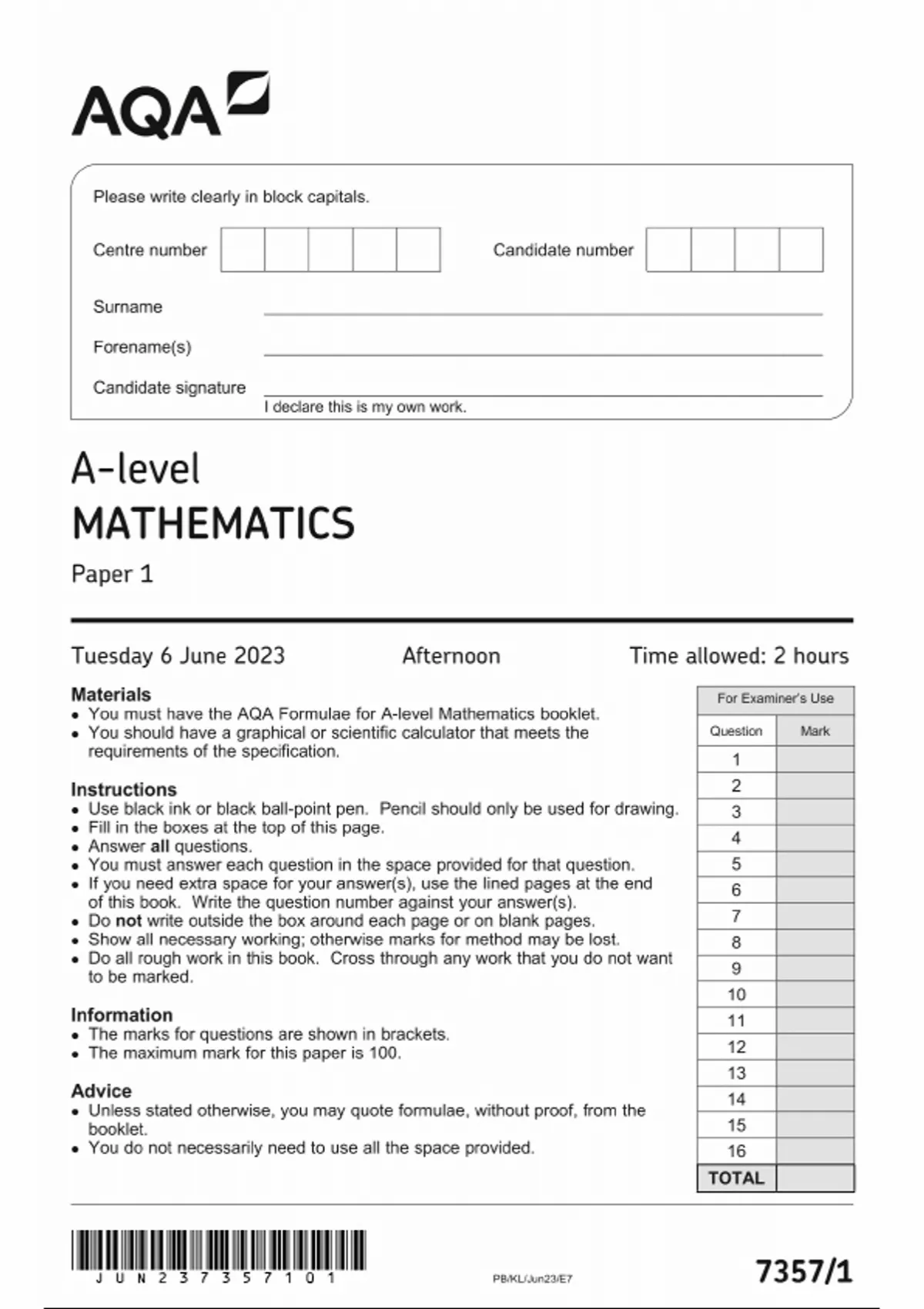 AQA A LEVEL MATHEMATICS QUESTION PAPER 1 2023 [7357/1]