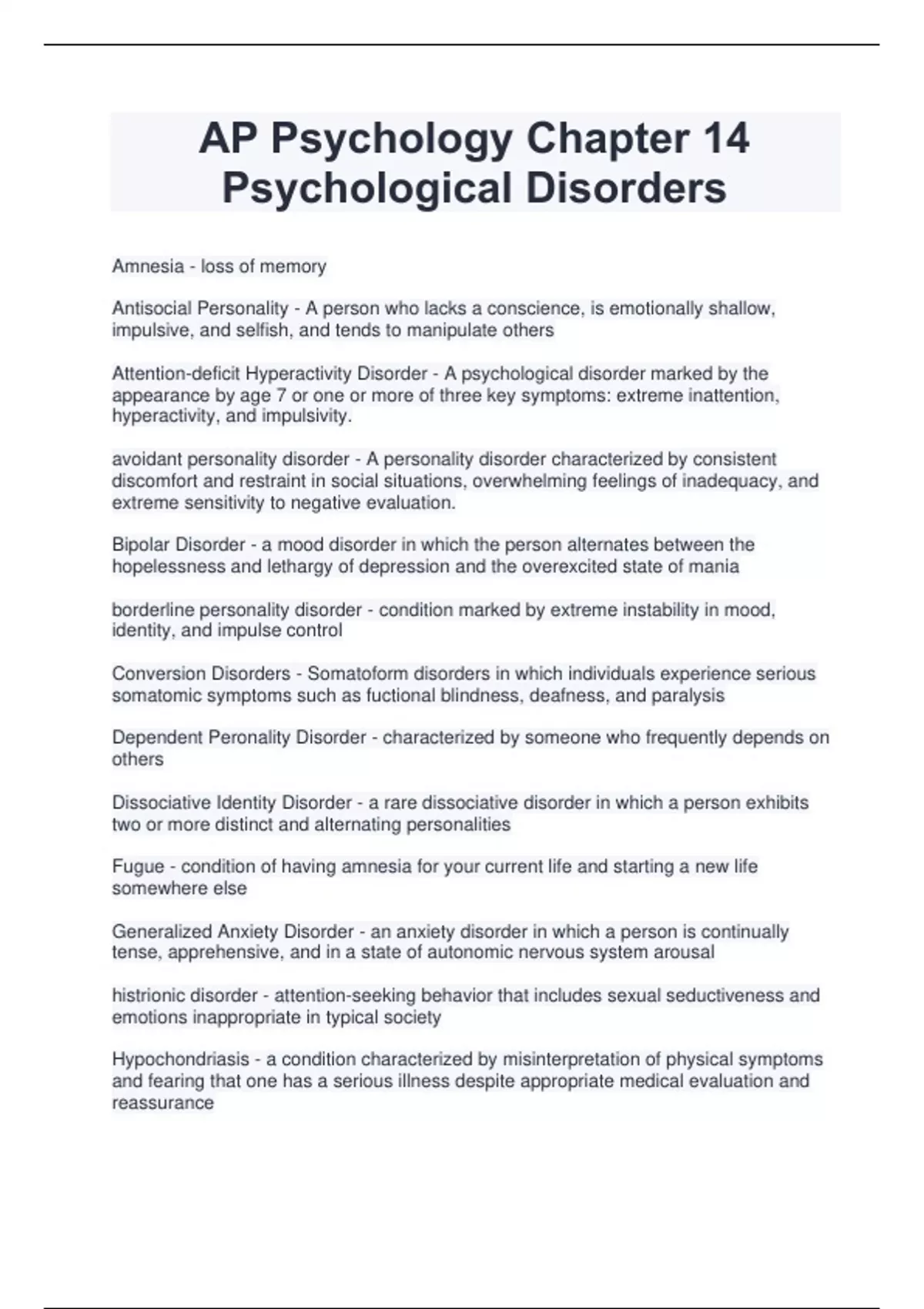 Amnesia - loss of memory Antisocial Personality - A person who lacks a conscience, is emotionally shallow, impulsive, and selfish, and tends to manipulate others Attention-deficit Hyperactivity Disorder - A psychological disorder marked by the appearance by age 7 or one or more of three key symptoms: extreme inattention, hyperactivity, and impulsivity. avoidant personality disorder - A personality disorder characterized by consistent discomfort and restraint in social situations, overwhelming feelings of inadequacy, and extreme sensitivity to negative evaluation. Bipolar Disorder - a mood disorder in which the person alternates between the hopelessness and lethargy of depression and the overexcited state of mania borderline personality disorder - condition marked by extreme instability in mood, identity, and impulse control Conversion Disorders - Somatoform disorders in which individuals experience serious somatomic symptoms such as fuctional blindness, deafness, and paralysis Dependent Peronality Disorder - characterized by someone who frequently depends on others Dissociative Identity Disorder - a rare dissociative disorder in which a person exhibits two or more distinct and alternating personalities Fugue - condition of having amnesia for your current life and starting a new life somewhere else Generalized Anxiety Disorder - an anxiety disorder in which a person is continually tense, apprehensive, and in a state of autonomic nervous system arousal histrionic disorder - attention-seeking behavior that includes sexual seductiveness and emotions inappropriate in typical society Hypochondriasis - a condition characterized by misinterpretation of physical symptoms and fearing that one has a serious illness despite appropriate medical evaluation and reassuranc