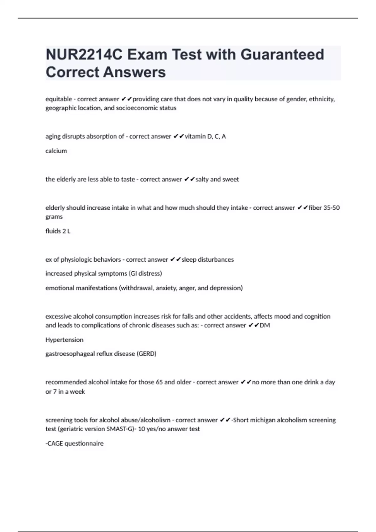 equitable - correct answer providing care that does not vary in quality because of gender, ethnicity, geographic location, and socioeconomic status aging disrupts absorption of - correct answer vitamin D, C, A calcium the elderly are less able to taste - correct answer salty and sweet elderly should increase intake in what and how much should they intake - correct answer fiber 35-50 grams fluids 2 L ex of physiologic behaviors - correct answer sleep disturbances increased physical symptoms (GI distress) emotional manifestations (withdrawal, anxiety, anger, and depression) excessive alcohol consumption increases risk for falls and other accidents, affects mood and cognition and leads to complications of chronic diseases such as: - correct answer DM Hypertension gastroesophageal reflux disease (GERD) recommended alcohol intake for those 65 and older - correct answer no more than one drink a day or 7 in a week screening tools for alcohol abuse/alcoholism - correct answer -Short michigan alcoholism screening test (geriatric version SMAST-G)- 10 yes/no answer test -CAGE questionnaire -Alcohol-related problems survey (ARPS) -Short ARPS (shARPS) older adults with depression may also have: - correct answer insomnia excessive daytime sleeping poor appetite lack of energy unwillingness to participate in recreational activities delerium - correct answer acute state of confusion types of delirium - correct answer hyperactive hypoactive mixed unclassified Risk factors for delirium - correct answer drug therapy infection fecal impaction electrolyte imbalance surgery metabolic problems neuro disorders circulatory, renal, pulmonary disorders nutritional deficiencies hypoxe