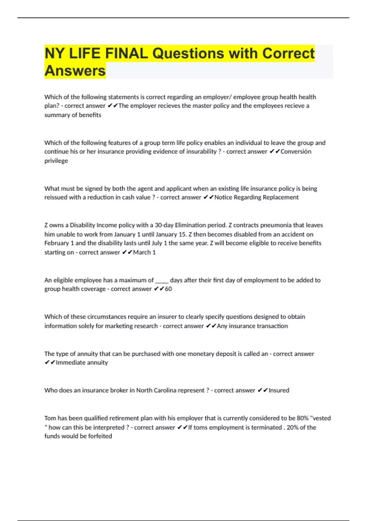 Which of the following statements is correct regarding an employer/ employee group health health plan? - correct answer The employer recieves the master policy and the employees recieve a summary of benefits Which of the following features of a group term life policy enables an individual to leave the group and continue his or her insurance providing evidence of insurability ? - correct answer Conversión privilege What must be signed by both the agent and applicant when an existing life insurance policy is being reissued with a reduction in cash value ? - correct answer Notice Regarding Replacement Z owns a Disability Income policy with a 30-day Elimination period. Z contracts pneumonia that leaves him unable to work from January 1 until January 15. Z then becomes disabled from an accident on February 1 and the disability lasts until July 1 the same year. Z will become eligible to receive benefits starting on - correct answer March 1 An eligible employee has a maximum of ____ days after their first day of employment to be added to group health coverage - correct answer 60 Which of these circumstances require an insurer to clearly specify questions designed to obtain information solely for marketing research - correct answer Any insurance transaction The type of annuity that can be purchased with one monetary deposit is called an - correct answer Immediate annuity Who does an insurance broker in North Carolina represent ? - correct answer Insured Tom has been qualified retirement plan with his employer that is currently considered to be 80% "vested " how can this be interpreted ? - correct answer If toms employment is terminated . 20% of the funds would be forfeited Deductibles are used in health policies to lower - correct answer overuse of medical services J has an Accidental Death and Dismemberment policy with a principal sum of $50,000. While trimming the hedges, J cuts off one of his fingers. What is the MAXIMUM J will receive from his policy? - correct answer $25,000 Medicare is intended for all of the following groups EXCEPT - correct answer Those enrolled as a full-time student N i