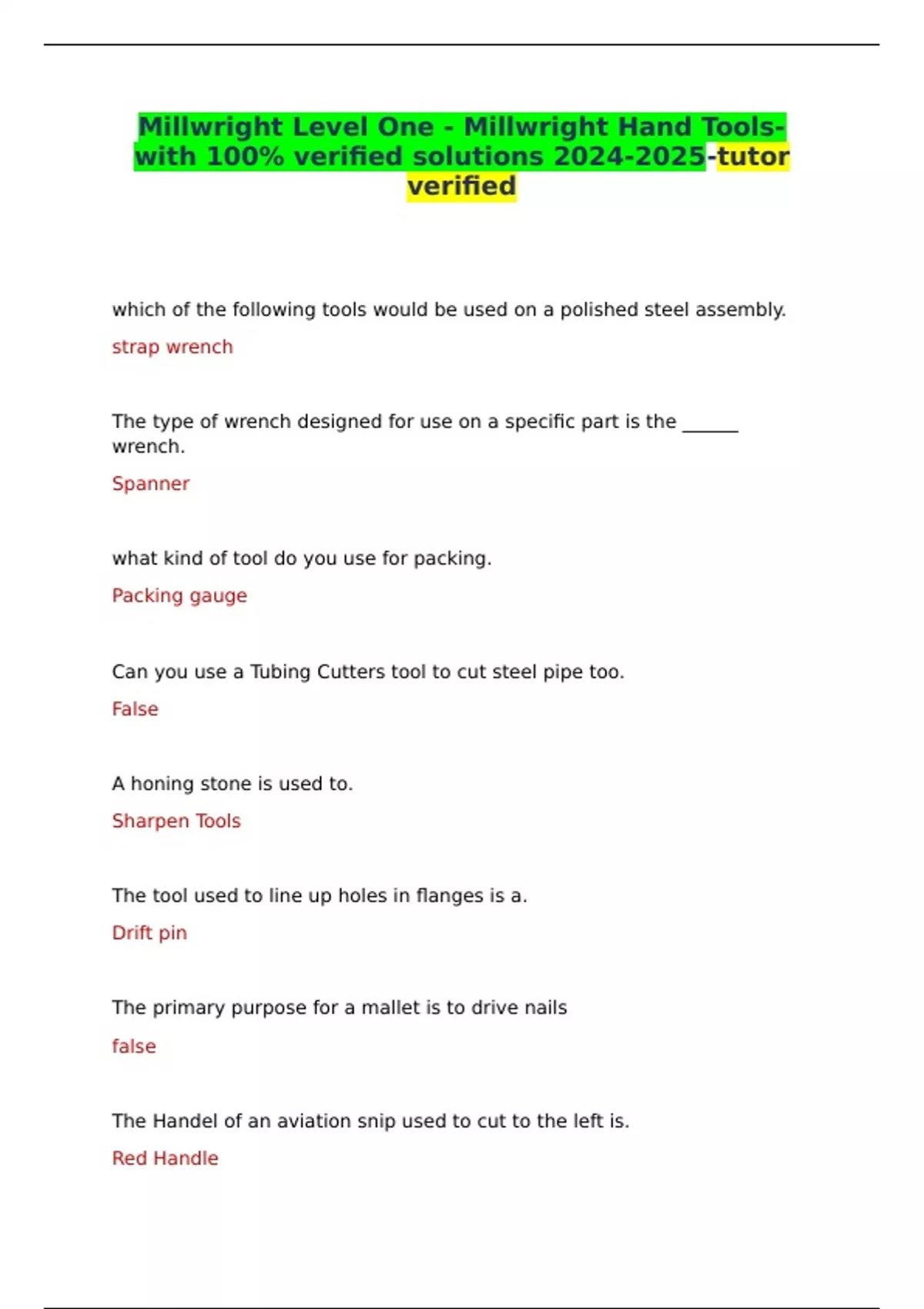 Millwright Level One - Millwright Hand Tools-with 100% verified solutions -tutor verified